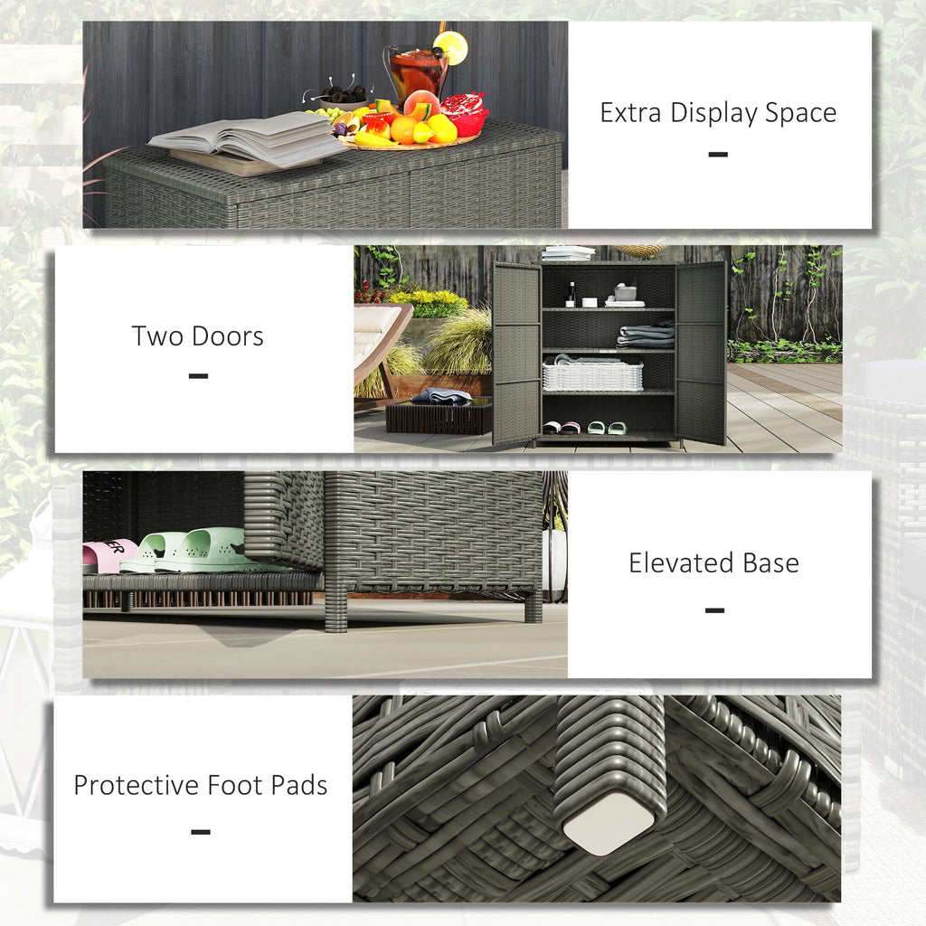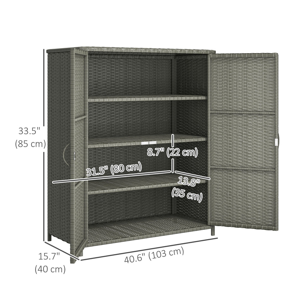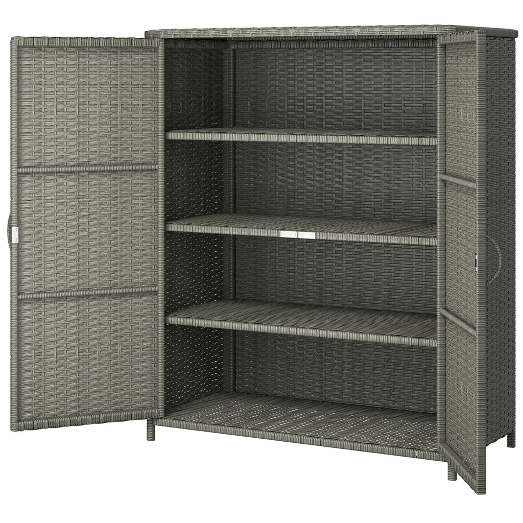 Keep your poolside organized and stylish with this spacious outdoor storage cabinet. Featuring a wide top surface and four shelves, it's perfect for storing pool towels, spa creams, sunscreen, swim caps, goggles, and other accessories. Constructed with a rugged powder-coated steel frame and handwoven PE rattan, this outdoor patio cabinet is designed for durability with 2000-hour UV protection, ensuring resistance to rust, fading, and weather. The two doors with wicker pulls and magnetic closures provide convenient access, making it easy to store and retrieve your essentials quickly. Ideal for the poolside, hot tub, beachfront, or deck, this cabinet brings a tropical resort vibe to your outdoor space.
