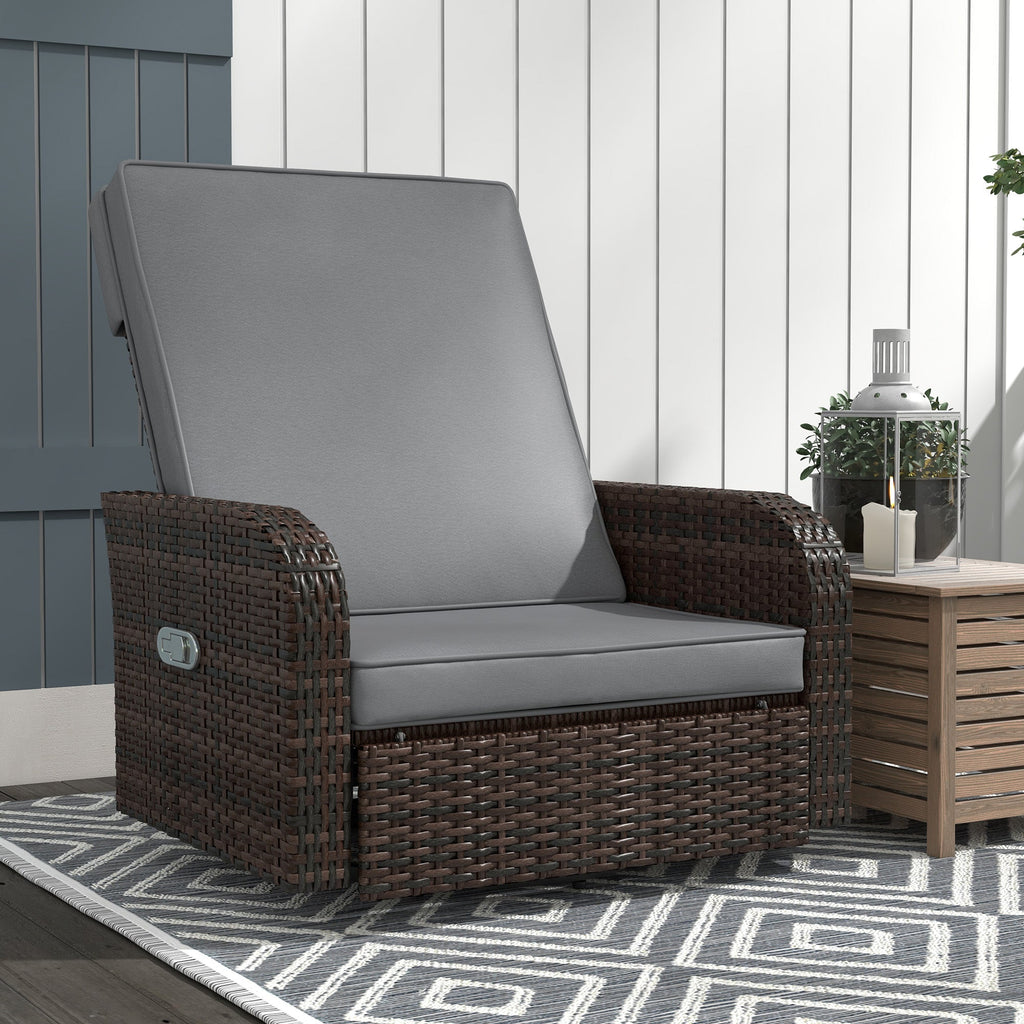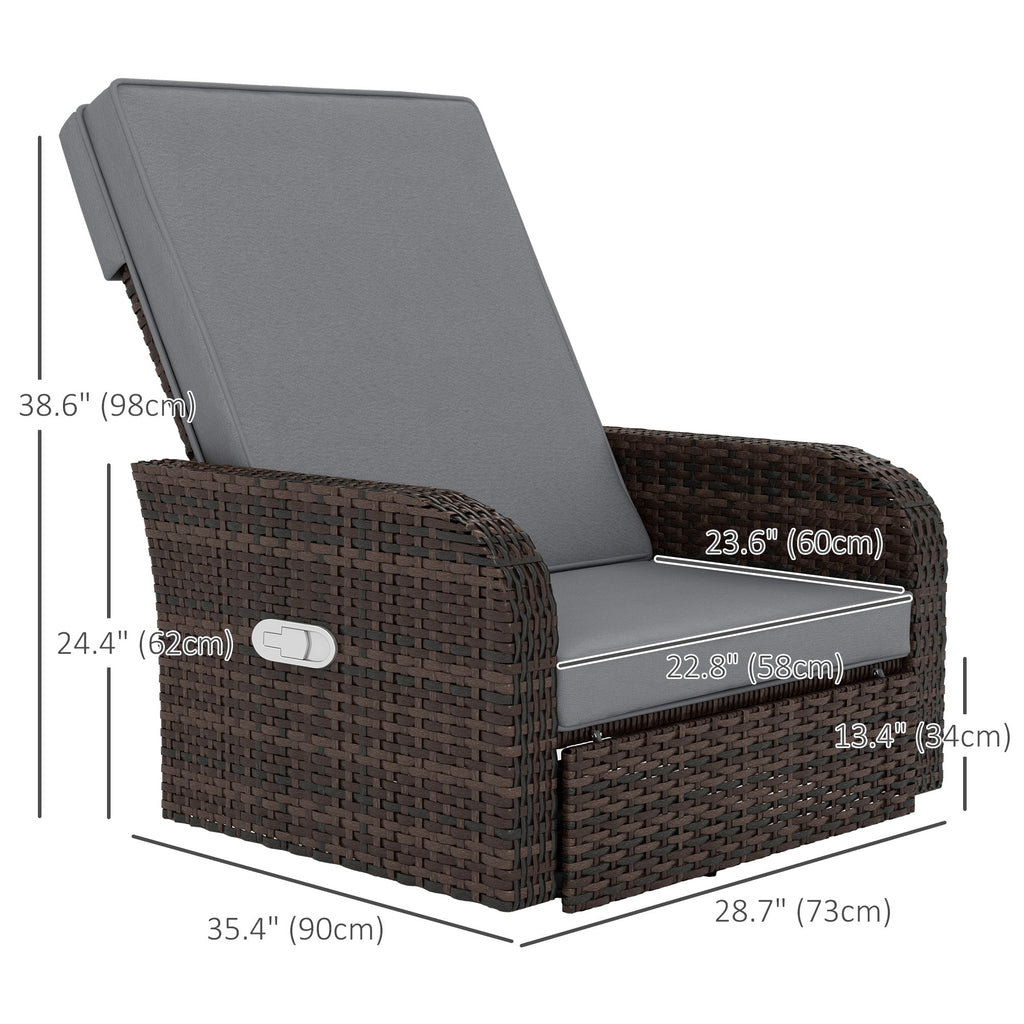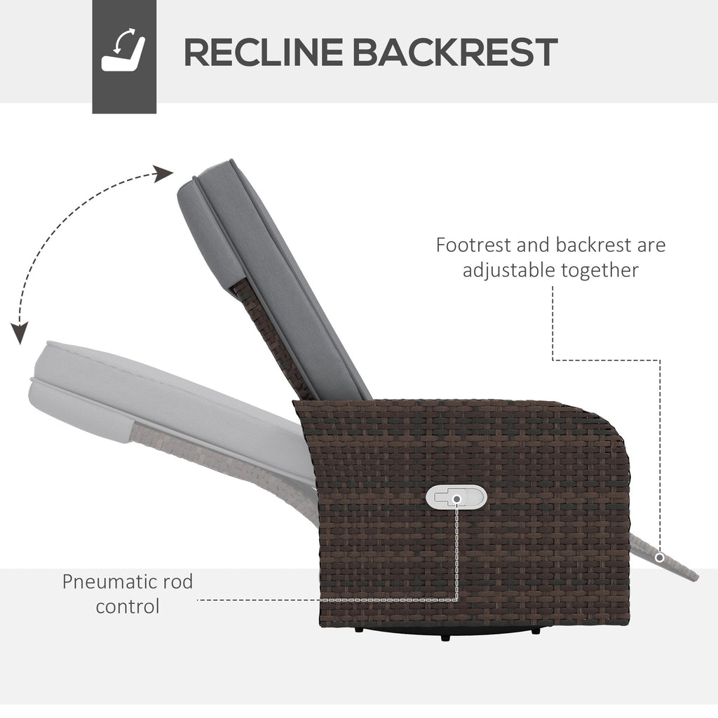 Relax in ultimate comfort with our 360-Degree Swivel Outdoor Wicker Recliner Chair. The stylish design of this chair features a smooth 360-degree swivel, allowing you to adjust your seating position effortlessly while reading, sipping coffee, or enjoying the outdoors. With a pneumatic control reclining mechanism, you can easily lean back and adjust the chair's backrest and footrest to find your perfect lounging angle. The soft, padded seat cushions provide long-lasting comfort and are secured with a fabric cover, ensuring an exceptional outdoor seating experience. Constructed with a durable metal frame, this chair is wrapped in weather-resistant PE rattan wicker, making it ideal for year-round outdoor use. Whether on your patio, garden, or by the poolside, this chair combines comfort and sophistication for your outdoor relaxation.