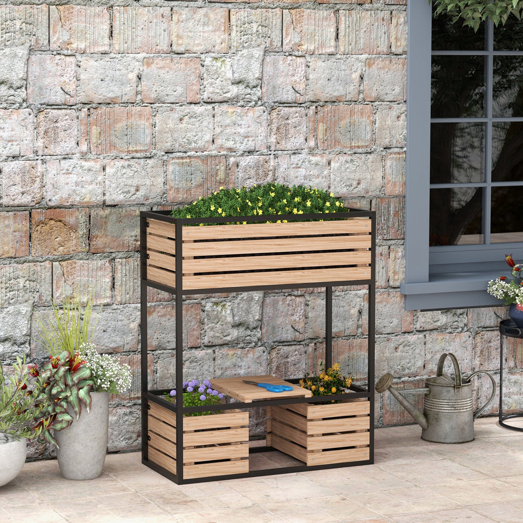 Maximize your garden space with this versatile Two-Tier Raised Garden Bed. Featuring one large and two smaller planter areas, it offers plenty of room to grow your favorite herbs, flowers, and vegetables. Whether you're tending to your garden, balcony, or backyard, this raised bed makes gardening more convenient and organized. The bottom shelf provides extra storage for gardening tools, flower pots, or other essentials, keeping everything within reach. Designed with a non-woven liner, it prevents dirt from falling through while allowing for proper water drainage, keeping your soil in great condition. Crafted from varnished fir wood and supported by a powder-coated steel frame, this durable garden bed is both functional and stylish. Its slatted wood design allows for ventilation, promoting plant health and creating an elegant outdoor display.