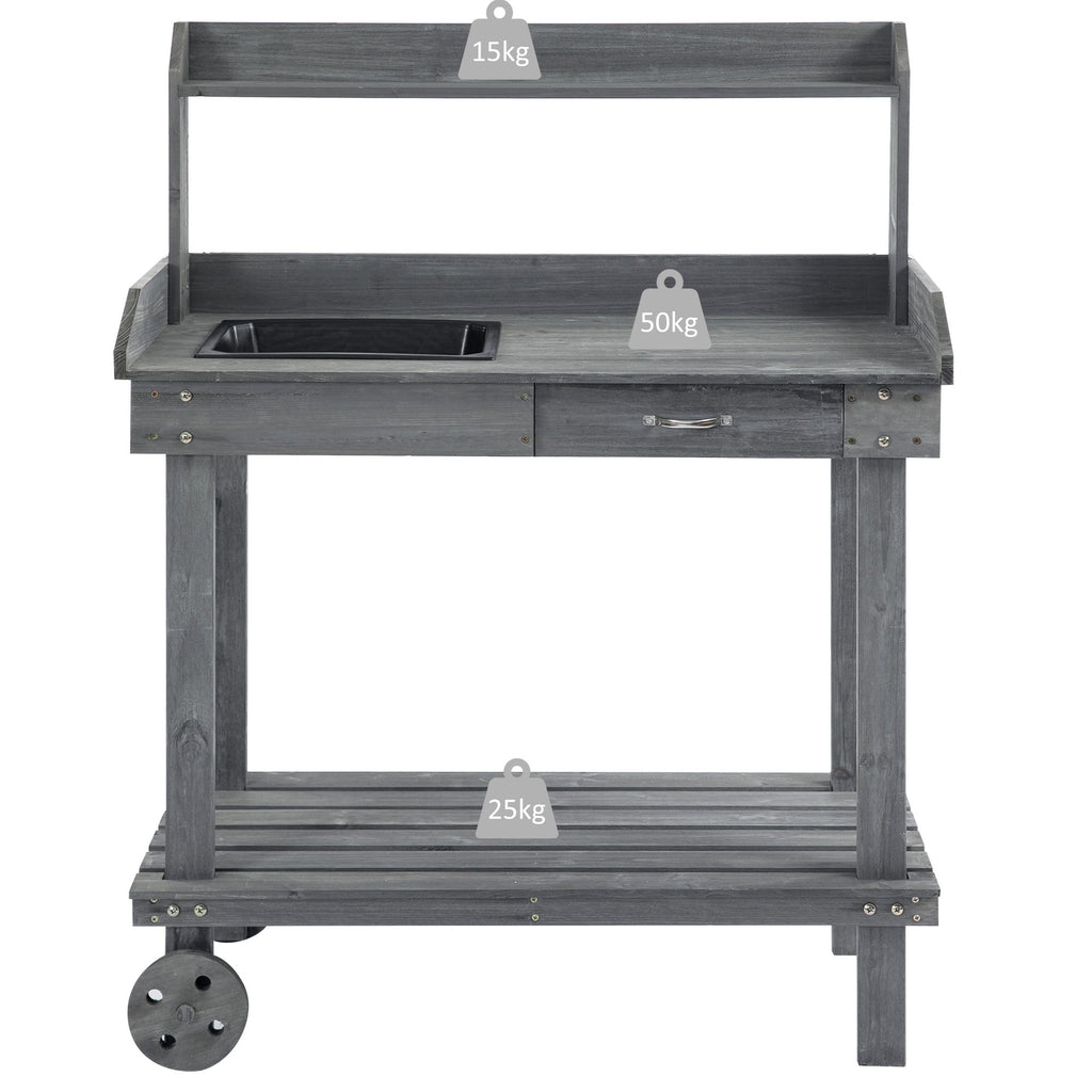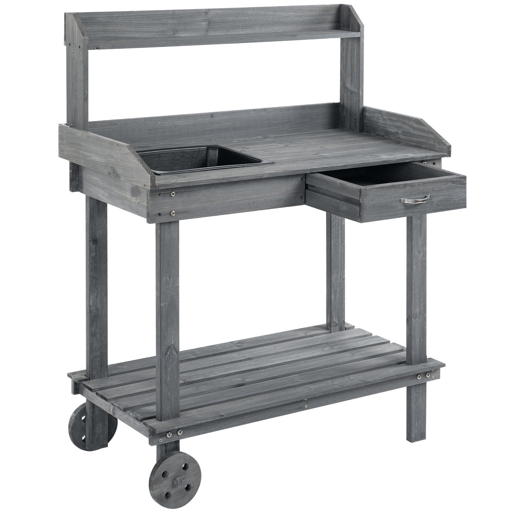 Make gardening more enjoyable and efficient with this mobile outdoor potting bench with sink. Designed for functionality and convenience, it features two detachable wheels for easy transport across your backyard, patio, or deck. The removable plastic sink simplifies watering and clean-up, while the spacious layout includes a large tabletop, drawer, and multiple shelves to keep all your gardening essentials organized and within reach. Crafted from 100% solid wood, this workstation is built to handle the elements and provide lasting performance season after season.