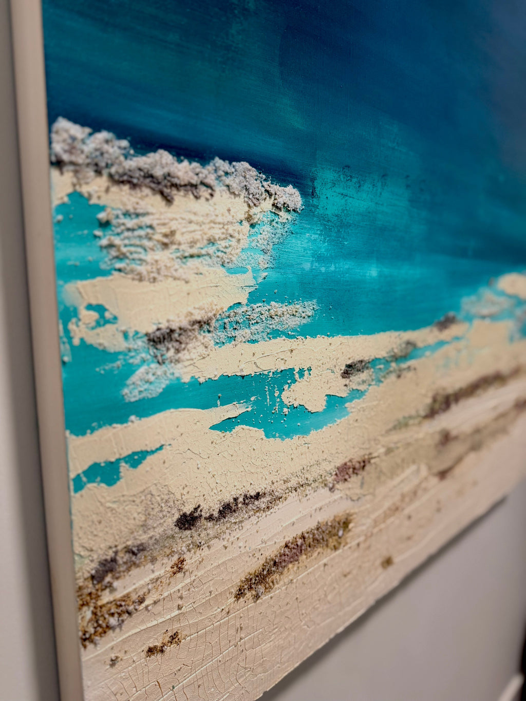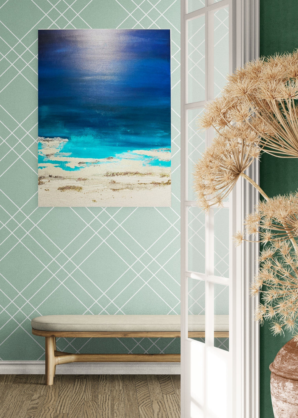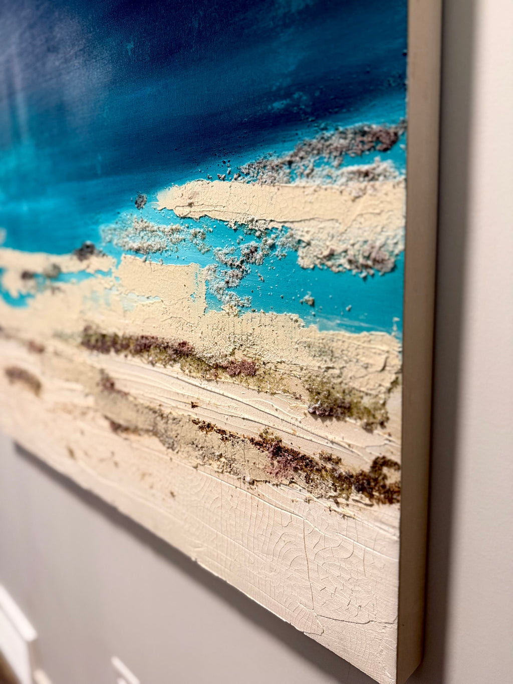 Introducing Pensacola, an elegant hand-painted birch panel featuring acrylic, mixed media, and metallic leaf accents. With crackle effects, glass beads, and gold and silver leaf, this 48"x36" artwork adds depth, sophistication, and exclusivity to any space.