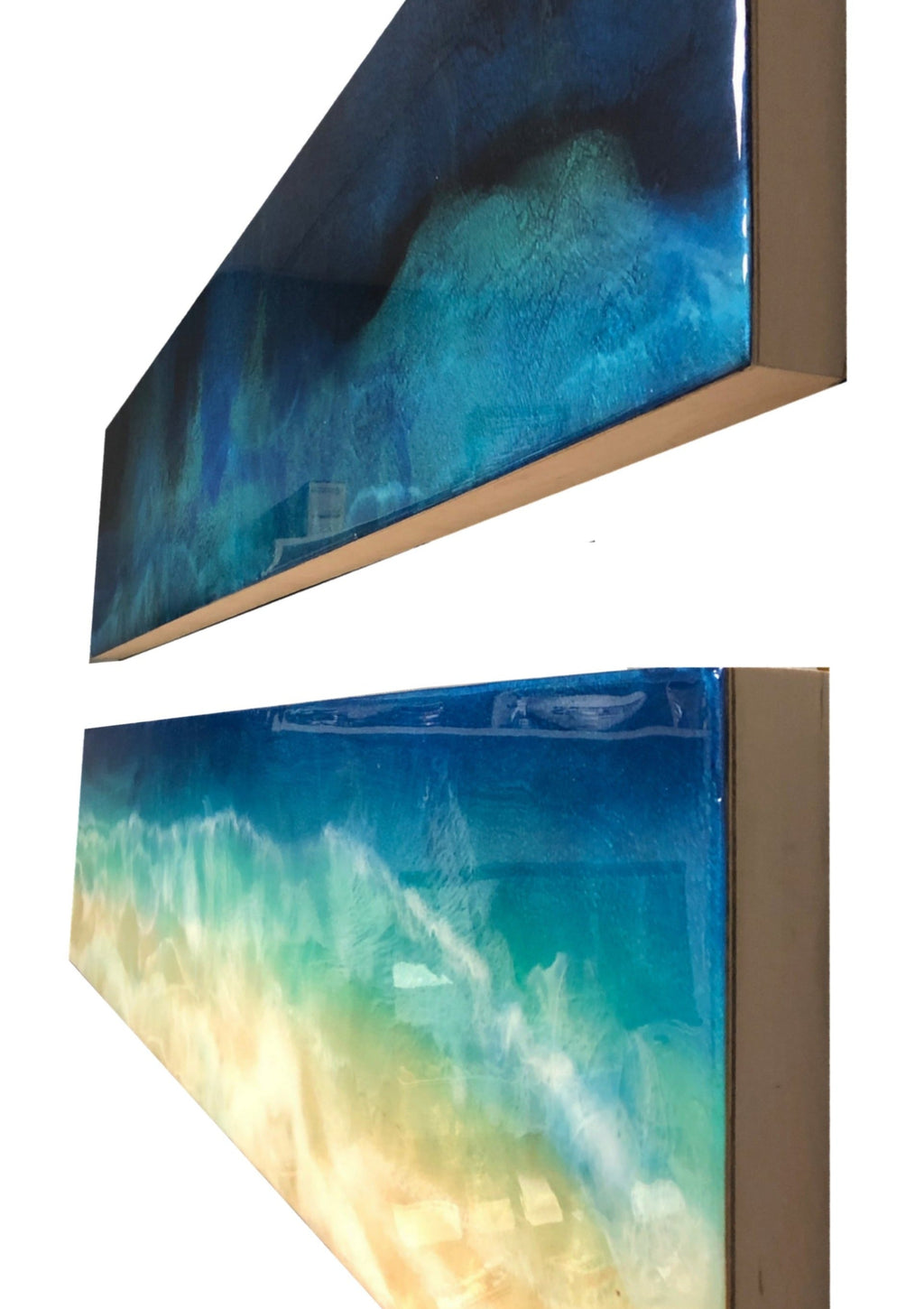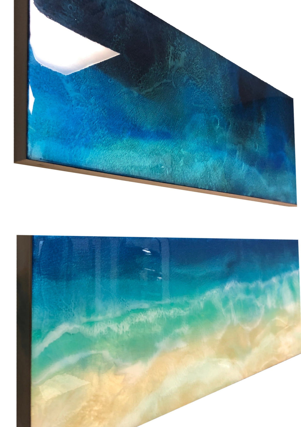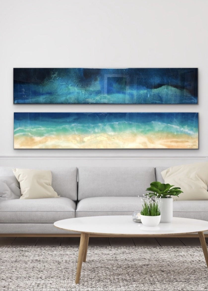 Explore the beauty of the ocean with Playa Norte, a stunning resin diptych painting. Featuring a mix of deep, dark tones with soft hints of teal, and sandy beach and wave details, this handmade 60"x12" artwork brings coastal charm and natural elegance to any wall.