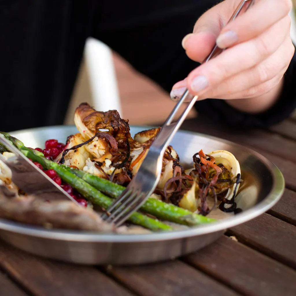 Enjoy your meals at the campsite or backyard picnic with the Primus CampFire Plate. Crafted from food-grade 18/8 stainless steel, this shallow-bowl plate is durable, flavor-neutral, and easy to clean. Its tapered, stackable design makes packing and storage simple, while the sleek style ensures it looks great wherever you dine. Perfect for everything from pancakes and grilled cheese to hearty pasta dishes.