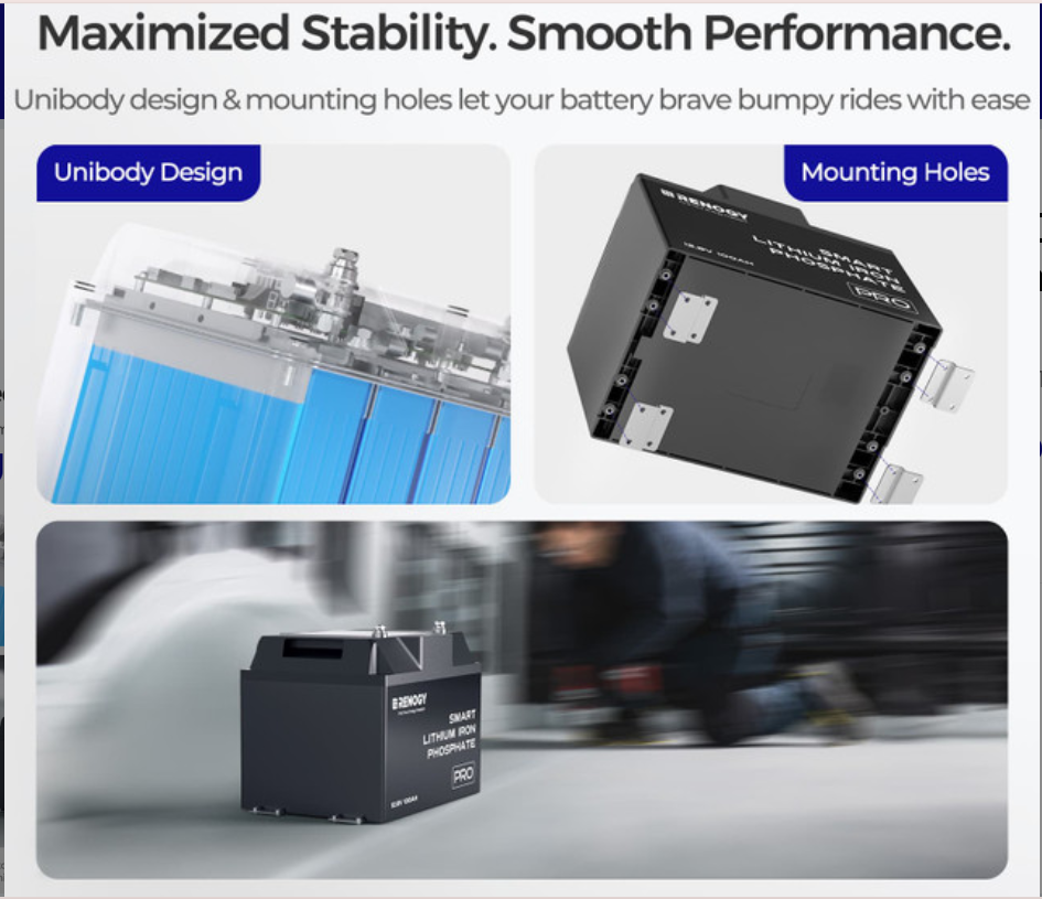 The Renogy Pro 12V 100Ah Smart Lithium Iron Phosphate (LiFePO4) Battery is a high-performance, compact power solution tailored for off-grid enthusiasts, RV campers, and marine adventurers. With a robust 1280Wh capacity, this battery efficiently powers demanding applications like RVs, boats, cabins, and solar systems. At just 25.3 lbs—30% lighter than equivalent lead-acid batteries—it features a space-saving BCI group-size design for easy drop-in replacement and installation.
