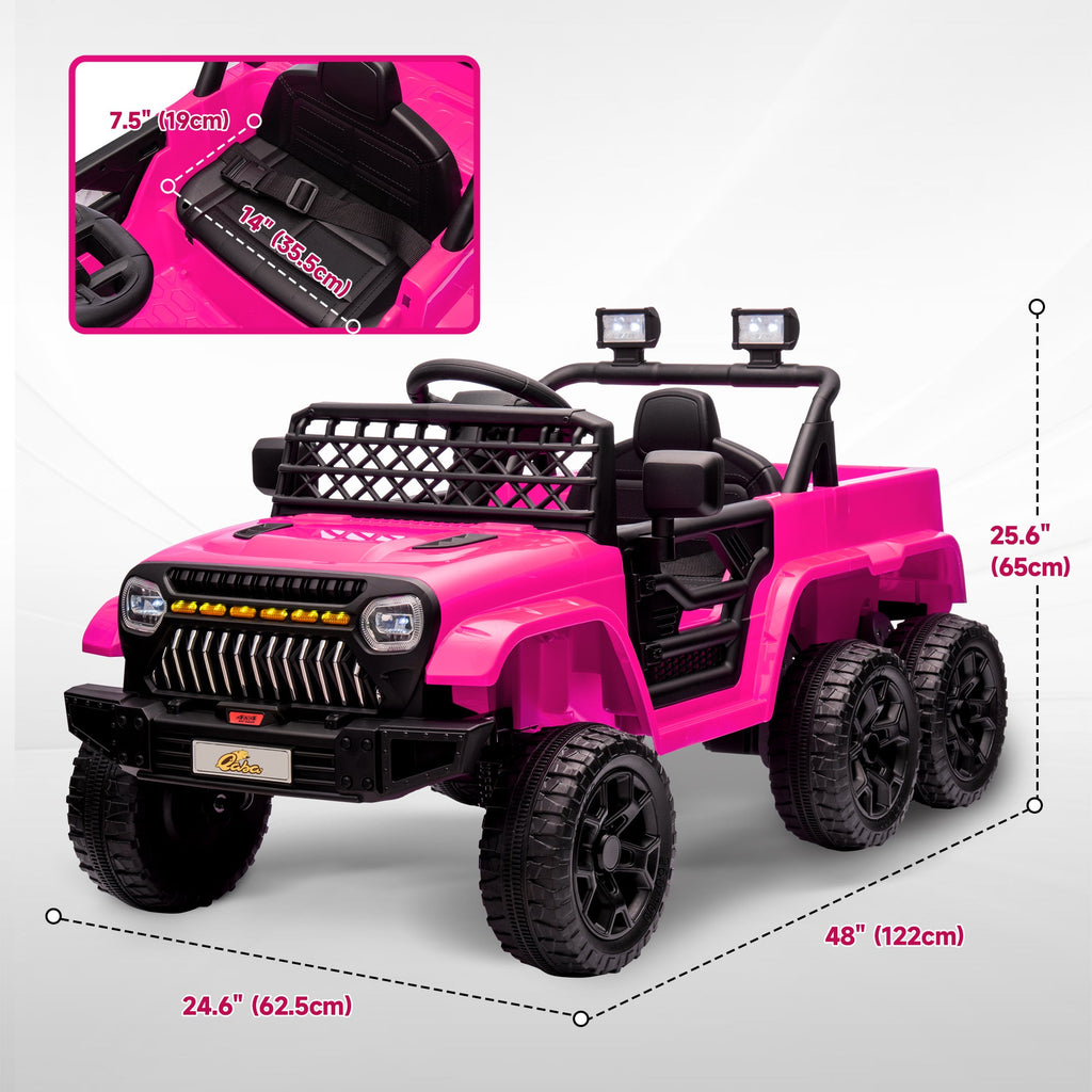 This 12V kids' electric car offers an exhilarating off-road experience and smooth driving, making it the perfect ride for young adventurers. With four powerful motors and a large 12V 7AH battery, it provides up to 1 hour of continuous playtime. The car effortlessly switches between 4x4 drive and 2x2 drive modes, allowing kids to enjoy both off-road thrills and smooth surface driving. It features six wheels, four of which are shock-absorbing for added bounce, ensuring a comfortable ride over flat surfaces like concrete and asphalt. The gentle soft start and safety belt ensure a secure and pleasant driving experience. With three selectable speeds (1.6-2.5 mph / 2.5-4 km/h), children can enjoy a realistic driving experience, or parents can take control using the included remote. The car is packed with fun features, including built-in music, a horn, lights, a one-button start, and a rear trailer for storage. Constructed from durable plastic and steel, this ride-on car is built to withstand hours of fun and is suitable for children aged 3-8 years. Compliant with SOR standards, it offers both safety and adventure in one package.