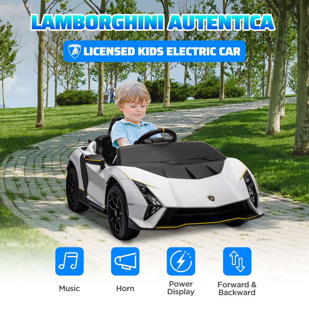 Give your child the ultimate driving adventure with the Licensed Lamborghini Autentica Special Edition ride-on car, a luxurious and realistic electric vehicle designed to turn heads and spark imagination. With its stunning butterfly doors and sleek Lamborghini styling, this ride-on car delivers a truly authentic supercar experience for young drivers. It features dual driving modes, allowing kids to take the wheel manually or letting parents control the fun remotely for added safety. With adjustable speeds ranging from 1.9 to 3.1 mph (3–5 km/h), it's perfect for toddlers seeking both excitement and control. The car operates smoothly thanks to dual 12V motors and a four-wheel suspension system, while soft start technology ensures safe, gentle acceleration. This electric car includes a variety of interactive features—USB port, light music, four LED lights, a working horn, forward and reverse driving, and a clear power display—making every ride thrilling and engaging. Built to hold up to 66 lbs (30 kg), this stylish kids' car is recommended for ages 3 to 6 and approved for ages 3 to 8. Its compact dimensions (45.1"L x 25.2"W x 17.9"H / 114.5 x 64 x 45.5 cm) make it ideal for both indoor and outdoor play. Certified to meet SOR safety standards, this ride-on car combines luxury, performance, and peace of mind for parents. Assembly is required.