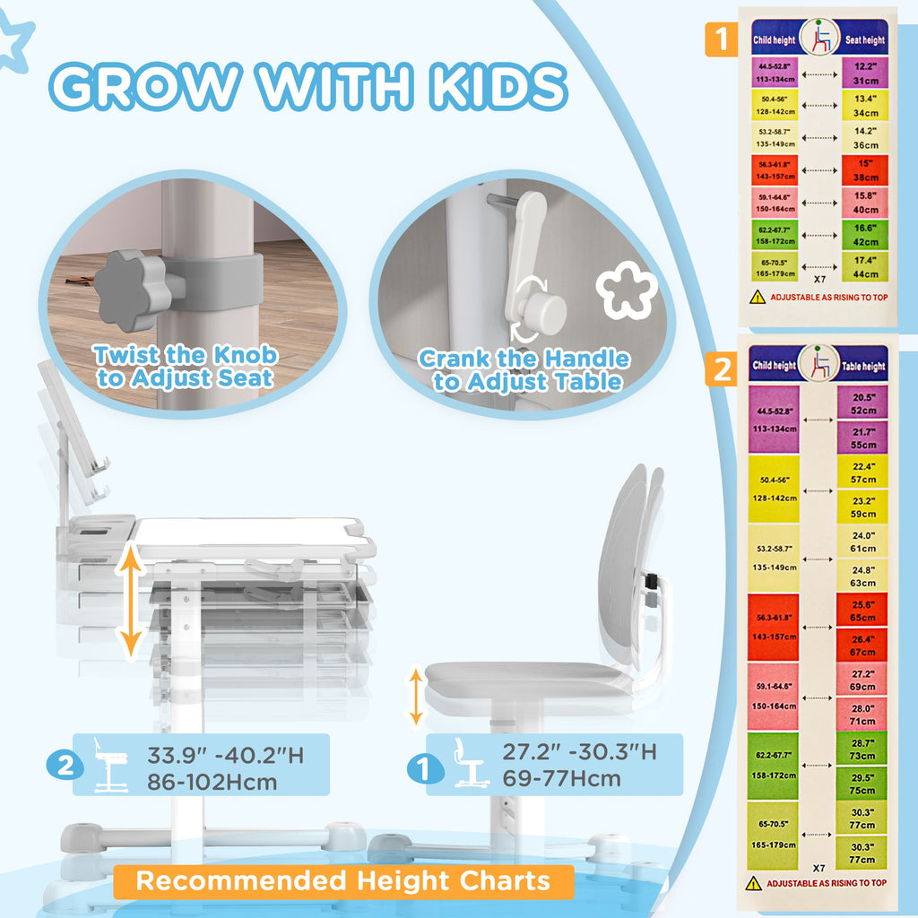 Adjustable height for both desk and chair to grow with your child