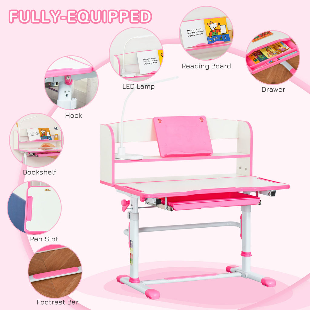 Create the perfect study environment for your child with this adjustable height desk and chair set, designed to grow with them and support healthy posture throughout their learning journey. The height of both the desk and chair can be easily adjusted using a safe rotation handle, ensuring ergonomic comfort as your child ages from 6 to 12 years. The desktop tilts from 0 to 40 degrees, promoting better reading, writing, and drawing positions while helping prevent poor posture and eye strain. This versatile set includes a functional drawer, movable reading board, pen slot, hook, and a bookshelf, as well as a USB-powered LED lamp with 28 bulbs and three adjustable color temperatures to protect young eyes during extended study sessions. The sturdy I-beam design, made of durable MDF and steel, guarantees long-lasting stability, while the ergonomic chair is built with a curved backrest and a footrest bar to provide proper support and relaxation. A non-slip base adds to the safety and comfort of this stylish and practical setup. Measuring 31.5" x 21.5", the table height ranges from 32.3" to 40.9", while the chair adjusts from 25.2" to 28.7", with impressive weight capacities of 176 lbs (table) and 220 lbs (chair). Easy to assemble and designed for both comfort and functionality, this desk and chair set is ideal for study rooms, bedrooms, or any dedicated learning space.