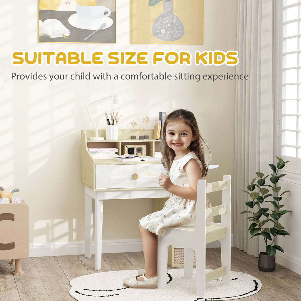 This kids desk and chair set offers spacious storage and a sturdy design, ideal for children aged 3-10 years. The desk features a double-layer shelf, a drawer, and two lower right storage grids, providing ample space to organize books, stationery, and school supplies. Constructed from safe, stable MDF, this set is built to last and supports your child's activities, giving you peace of mind during both study time and playtime. With its appropriately sized desk and chair, it’s designed to accommodate growing children, making it a perfect study and craft table for various activities. In addition to serving as a study desk, this set also doubles as a creative workspace for drawing, painting, and other artistic projects, encouraging your child’s creative expression. Whether it’s for schoolwork or creative fun, this multipurpose table is sure to inspire learning and creativity in your child.