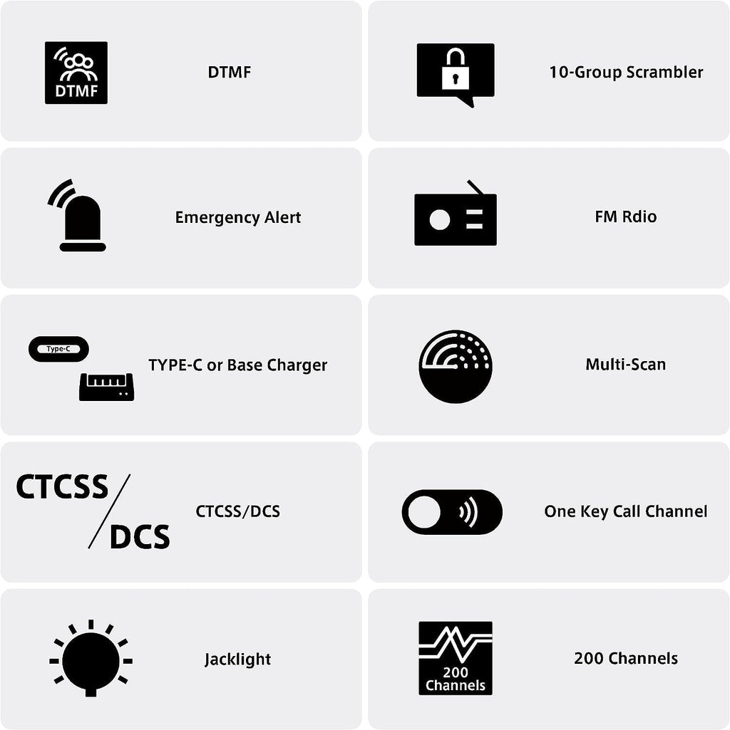 Enhanced Features: DTMF, 10-group scrambler, FM radio, CTCSS/DCS, and emergency alert.