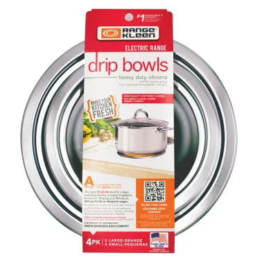 The Range Kleen® Chrome Drip Bowls, Style A, 6-Inch and 8-Inch (4 Pack) are the perfect replacement for your stove's worn or damaged drip pans. Designed to fit most standard ranges, these chrome drip bowls are durable, easy to clean, and built to withstand heat and constant use. The sleek chrome finish adds a polished look to your stove, while the simple, functional design helps catch spills and splatters, keeping your stovetop looking neat and tidy. This 4-pack set includes both 6-inch and 8-inch pans, offering compatibility with different burner sizes for a complete solution.