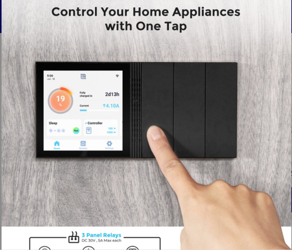 - Connected Living: Control up to three DC appliances (30V DC, 5A max) directly through the panel’s relays using physical switches or the DC Home app. Create custom smart scenes like “Evening” mode to turn on lights or “Sleep” mode to dim lights and power down appliances, enhancing convenience and efficiency.