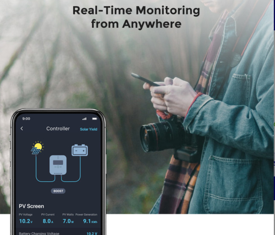 - 24/7 Energy Monitoring: Track performance data from LiFePO4 batteries, charge controllers, inverters, and other connected devices via Bluetooth, RS485, or RV-C communication protocols. View up to 200 days of historical data on solar power generation, charging/discharging cycles, and power consumption trends to optimize your energy usage.