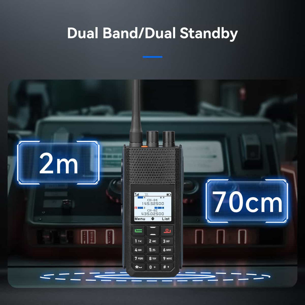 Dual Band / Dual Mode / Dual Standby: Operates on 2m & 70cm bands; smooth transition between analog FM and digital DMR; monitor two channels simultaneously