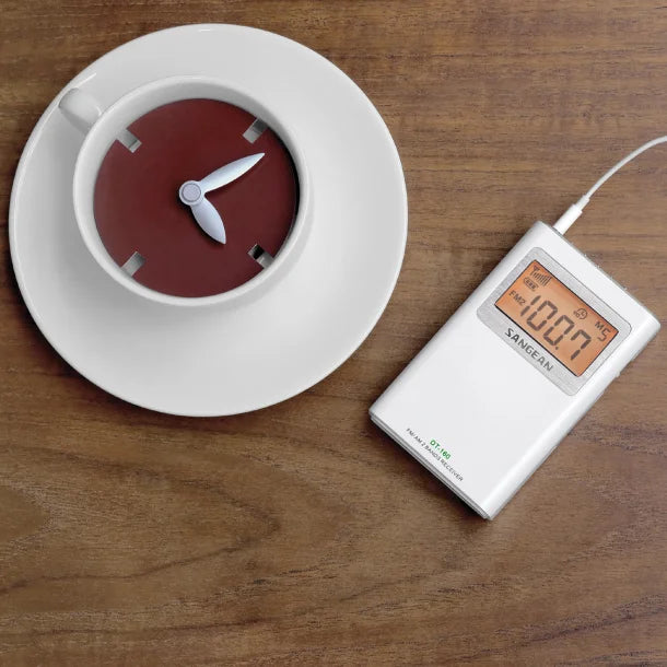 Sangean® AM/FM-Stereo Pocket Digital Clock Radio with Earbuds, White, DT-160