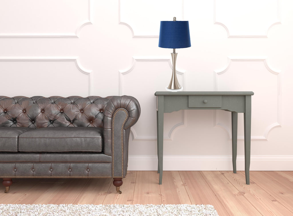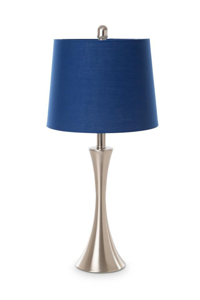 This set of two 26" silver metal table lamps with blue empire shade is the perfect combination of design and function. The base of this lamp is made of metal finished in a silver tone. The blue shade has a empire shape and is made of cotton, which makes it a perfect choice. This standard table lamp is designed to provide general lighting to the area. Use this lamp anywhere and elevate the look of the whole space. The perfect lamp to create just the right natural and soothing light in your space. 26" H x 5.5" W x 5.5" D