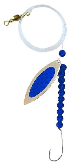 This Willow Leaf Spinner features a fierce Dark Blue Demon blade matched with transparent blue beads, creating a sleek, high-contrast presentation that excels in clear or deep water. The dark blue blade radiates subtle flash and depth, mimicking natural prey, while the translucent blue beads add a touch of shine without spooking wary fish. The willow blade’s slim shape produces a tight wobble and supports fast retrieves—perfect for tempting bass, trout, walleye, and panfish in clear or pressured waters.