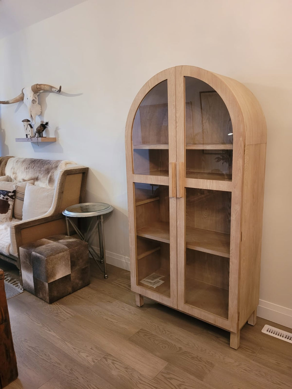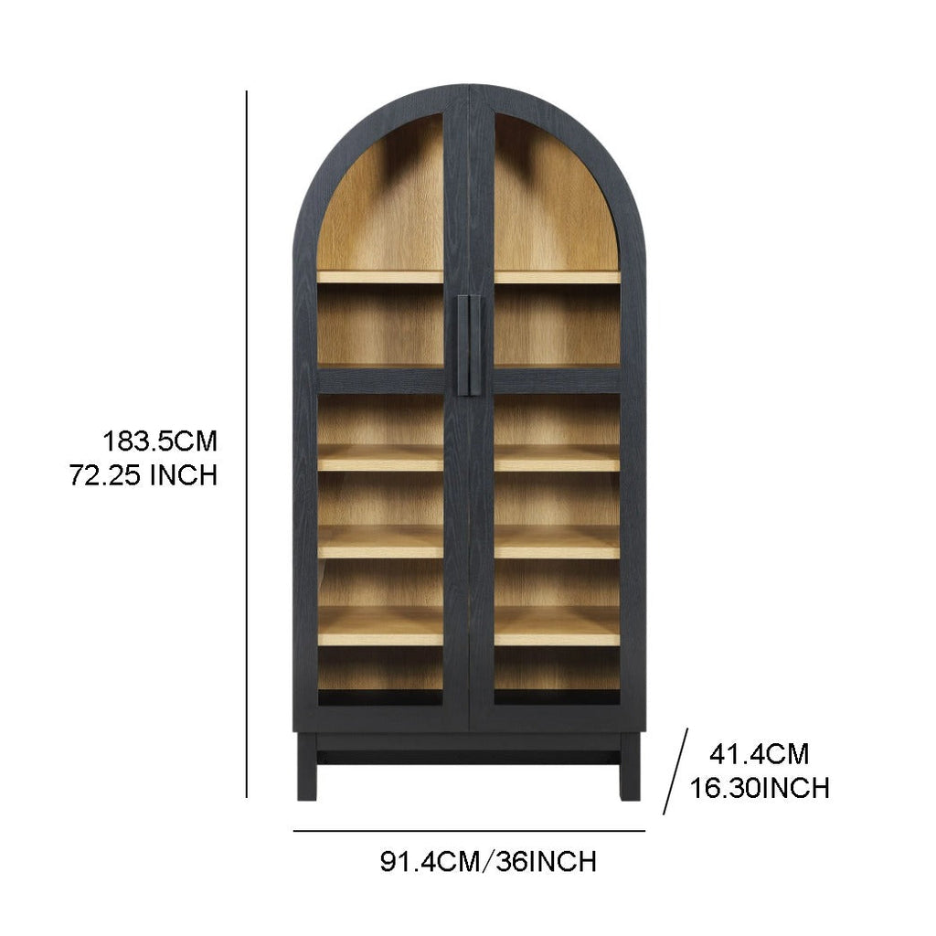 With five interior shelves, this cabinet provides ample space to store and display your cherished items, from fine China and heirlooms to books and decorative pieces. The tempered glass doors not only enhance its aesthetic appeal but also allow a clear view of the contents, while the soft-closing mechanism ensures smooth, quiet operation. With no assembly required, the Solid Wood Frame Arc Cabinet effortlessly combines style, functionality, and sophistication for your home.