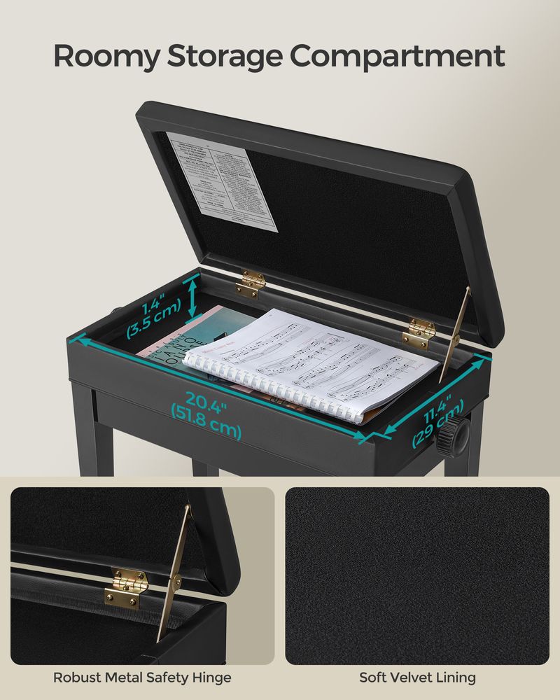 Built-In Music Storage: The spacious compartment beneath the seat provides a convenient spot for sheet music, books, and small accessories. A folding lip support keeps the lid securely open while accessing your items.