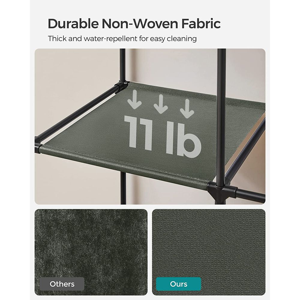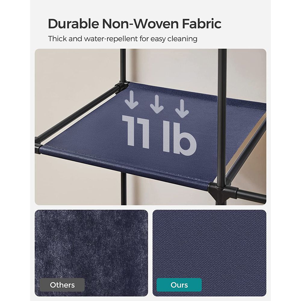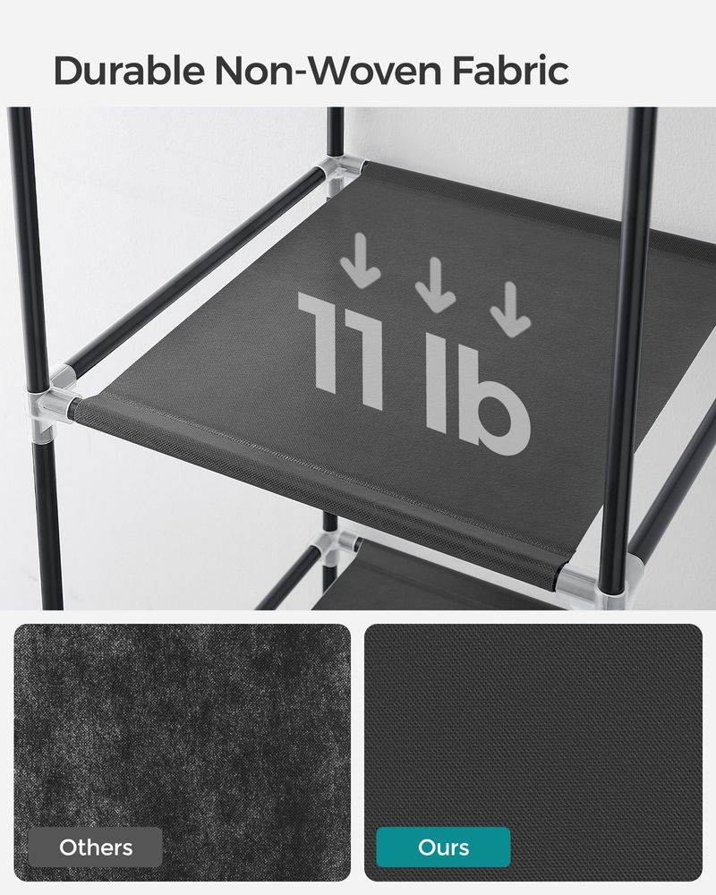 Sturdy & Durable Construction: Built with strong metal tubes and reinforced plastic connectors, this closet offers excellent stability. Each shelf holds up to 11 lb, and the hanging rail supports up to 33 lb, with a total capacity of 99 lb.