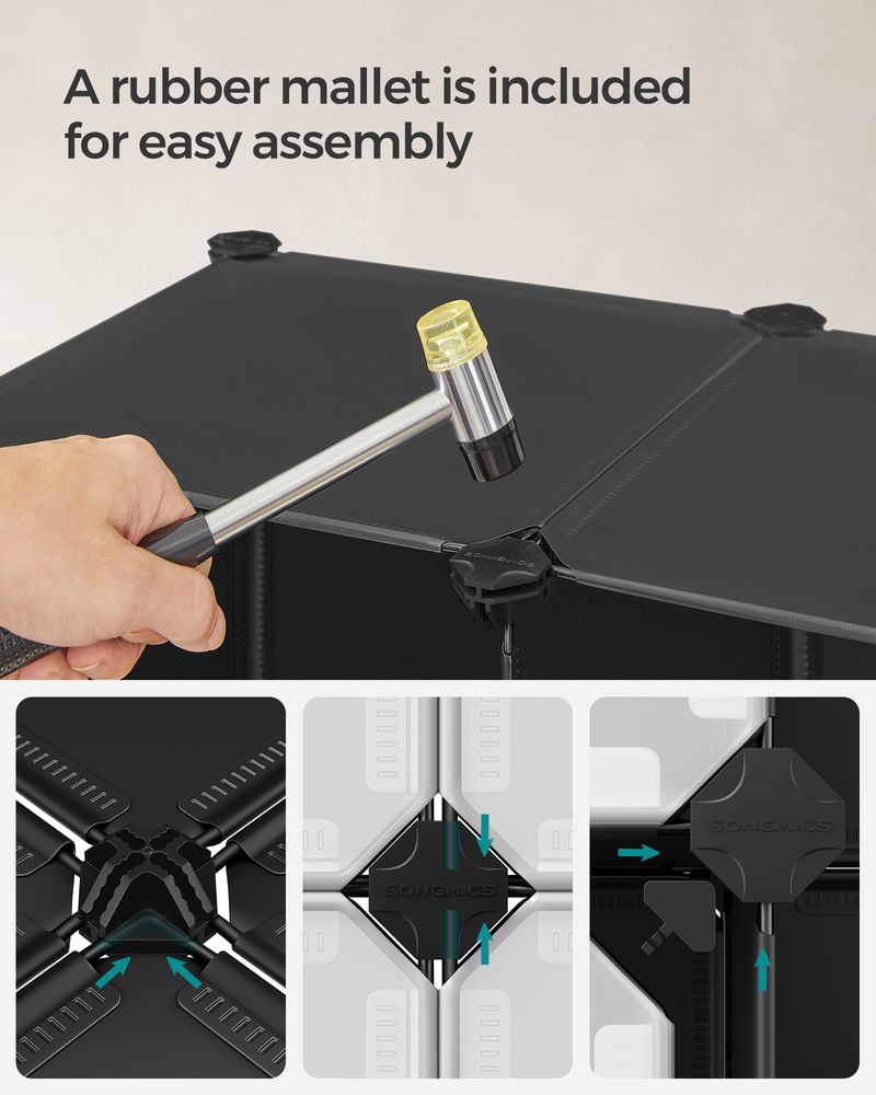 The SONGMICS Cube Storage with Door, Set of 12 Plastic Cubes, offers a stylish and practical way to organize your home. Whether you need to store folded clothes, bags, books, or toys, this modular organizer adapts to your needs with its customizable plug-in design. Each cube features a secure door with an umbrella-shaped hook that ensures it stays closed tightly, preventing accidental openings. Built with a robust metal frame and durable ABS connectors, this cube storage system provides reliable stability and strength. Its waterproof, dustproof panels make cleaning effortless, while the anti-tip kit ensures safe use in any room.