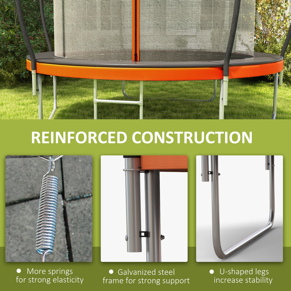 Bring safe and fun outdoor play to your backyard with this high-quality 10FT trampoline, designed with user safety and durability in mind. It features a fully enclosed net and thick padding over the steel posts and springs to prevent accidental injuries during play. The spring cover and jump mat are tightly integrated to prevent feet from slipping through. The safety pad is placed inside the net, giving jumpers more usable space and a safer bounce zone. Built with 54 high-tension steel springs and 3 outstretching U-shaped legs, this trampoline delivers strong elasticity and superior stability. The dense PP jumping mat offers great rebound and minimizes joint strain for a better experience. A zippered entry provides easy access, and a ladder is included for convenient use.