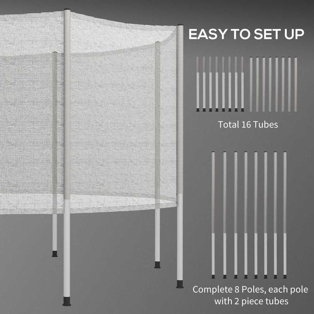 Enhance your trampoline's safety with this 12FT Trampoline Protection Net, designed to keep your child safe while they jump. The net securely connects between the pad and the jumping mat, preventing falls and ensuring a fun, safe jumping experience. Crafted from UV-resistant terylene-quality material, this safety net is durable and built to withstand outdoor conditions. The net features a rust-resistant steel frame, as well as straps and ropes for secure attachment to the trampoline. Easy to set up, the net includes 8 poles, each with 2-piece tubes (total of 16 tubes) for a straightforward installation process. Additionally, the net features a dual closure entry with a zipper and buckles, providing easy access. Foam-padded frame poles offer extra protection for added peace of mind.