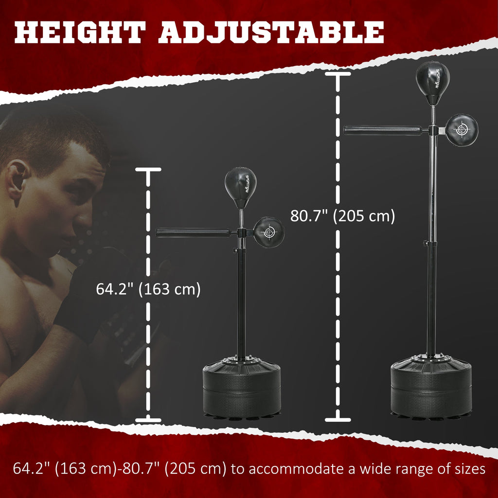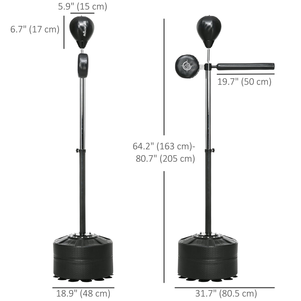 Enhance your boxing training with this speed ball set, designed to improve reaction time, accuracy, and agility. The 360° reflex bar allows you to simulate sparring scenarios by dodging, reacting, and punching back, providing a dynamic and realistic workout experience. The adjustable height (64.25" to 80.75") accommodates users of various sizes, including teenagers, adults, and professional athletes. The stable base can be filled with sand or water, providing extra support and stability, while 12 suction cups underneath ensure the reflex bag stays firmly in place during use. Wraps are included to protect your fists during training.