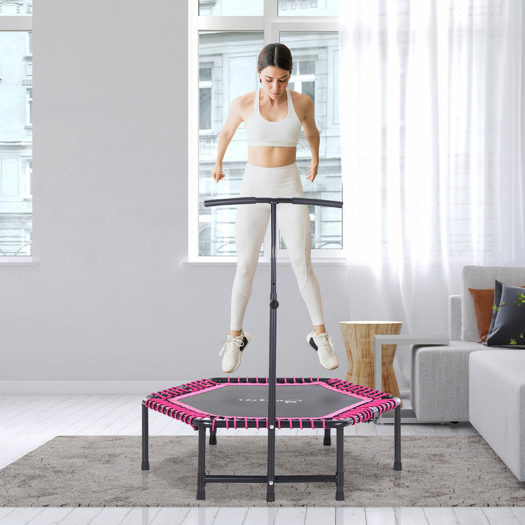 Experience fun and effective workouts with the Folding Fitness Trampoline, designed for portability and easy storage. Perfect for small spaces, this trampoline can be folded twice for convenient storage under your bed, in the closet, or behind the sofa. It features a 3-level adjustable T-bar handle for comfort during your jumping exercises, making it suitable for both children and adults. Built with a heavy-duty anti-rust steel frame and a durable all-weather PP jumping mat, this trampoline is designed for both indoor and outdoor use. The sturdy 6-leg base, with rubber caps, enhances stability and prevents floor damage. Whether you’re improving flexibility, boosting your heart rate, or having fun, this trampoline promotes a healthy lifestyle for everyone in the family.