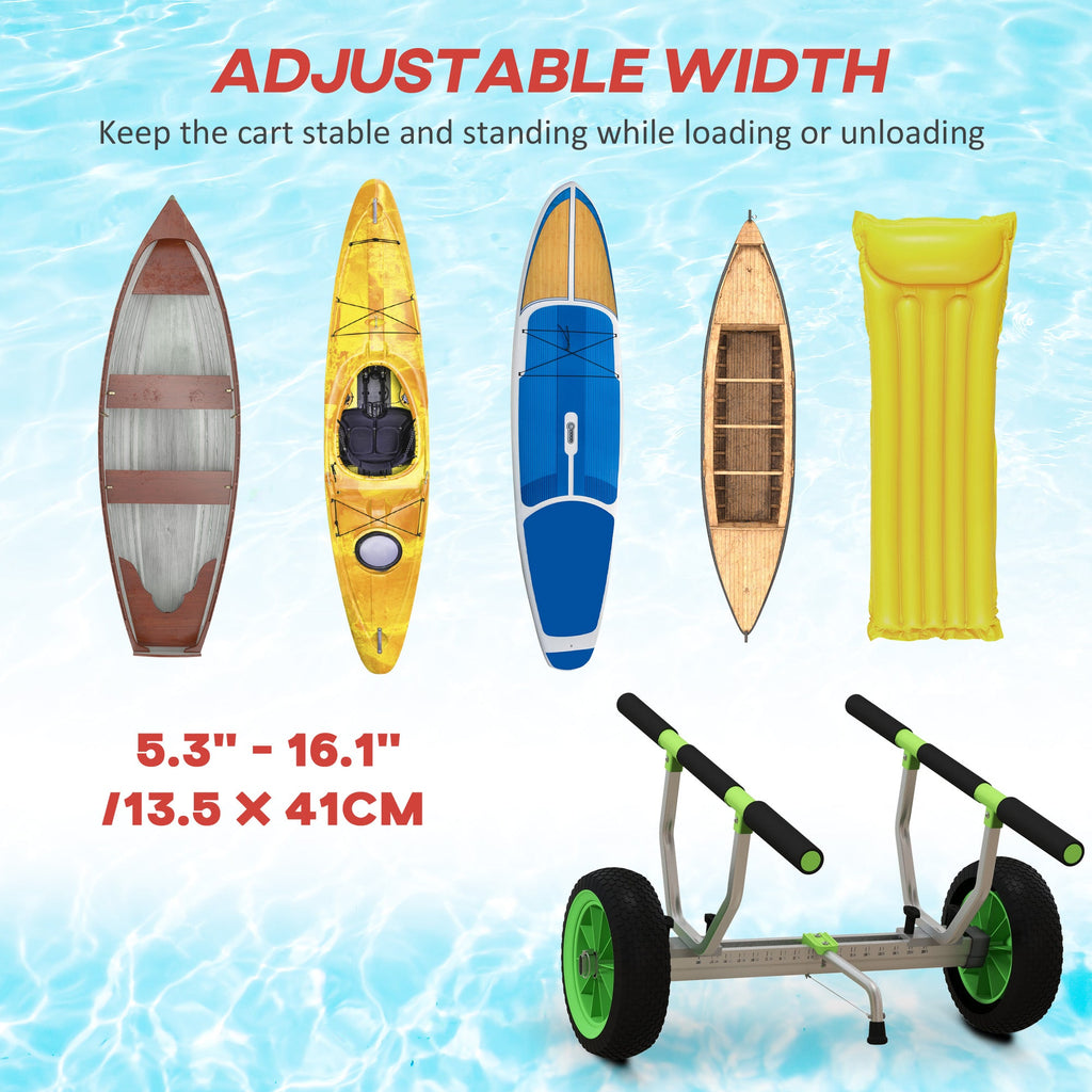 Transport your kayak with ease using this Width Adjustable Kayak Cart. Its adjustable frame, ranging from 5.3" to 16.1", allows you to balance the weight and prevent tip-overs by shifting the center of gravity based on your kayak’s design. The kickstand provides extra stability, allowing the cart to stay upright during loading or unloading. Featuring 10" all-terrain tires, this cart can smoothly roll over various surfaces like sand, gravel, and grass. Constructed from high-strength anodized aluminum, it’s built to support up to 220 lbs (100 kg), ensuring long-lasting durability for your outdoor adventures. This cart is equipped with two straps to secure your kayak during transport.