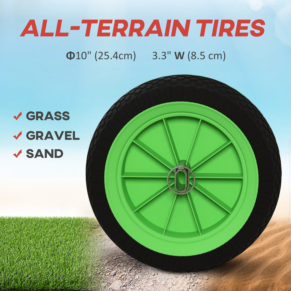 All-Terrain Tires: 10" solid tires designed to navigate rough terrain like sand, gravel, and grass.