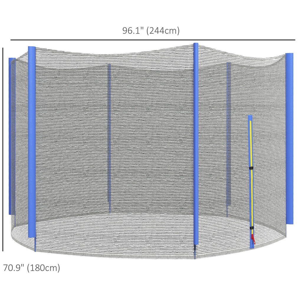 Dimensions: Φ96" x 70.9" H (Φ244 x 180 cm). Fits 8ft (244 cm) round trampoline frames with 6 straight poles. (Poles not included)