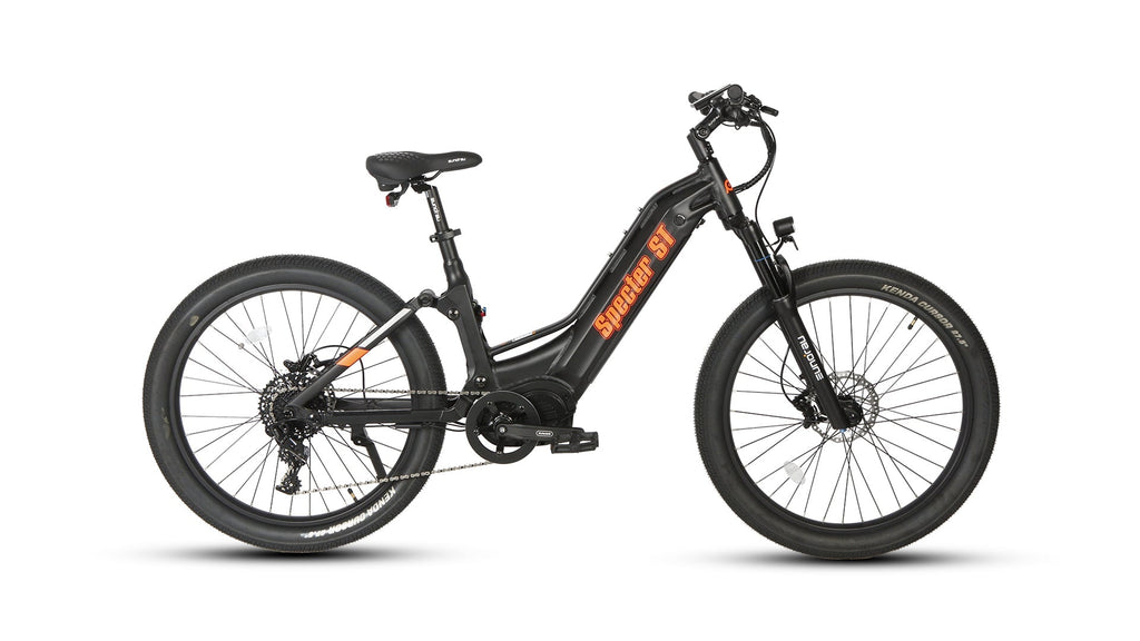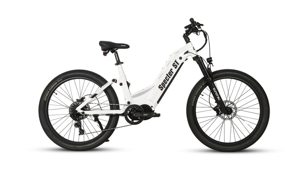 Conquer trails and urban streets with the SPECTER-ST 2.0 27.5" MTB Step-Thru E-Bike. Featuring a powerful 48V 1000W BAFANG mid-motor with 160 N.m torque and an optional dual battery system, this e-bike delivers up to 80 miles of ride time. Its step-thru aluminum frame, 140mm travel suspension fork, and 165mm rear shock provide comfort and stability on rough terrain. The BAFANG DPC18 display, thumb throttle, and SRAM 11-speed drivetrain ensure full control, while LED lights enhance safety for day or night riding. Perfect for riders seeking power, performance, and convenience in a versatile step-thru design.