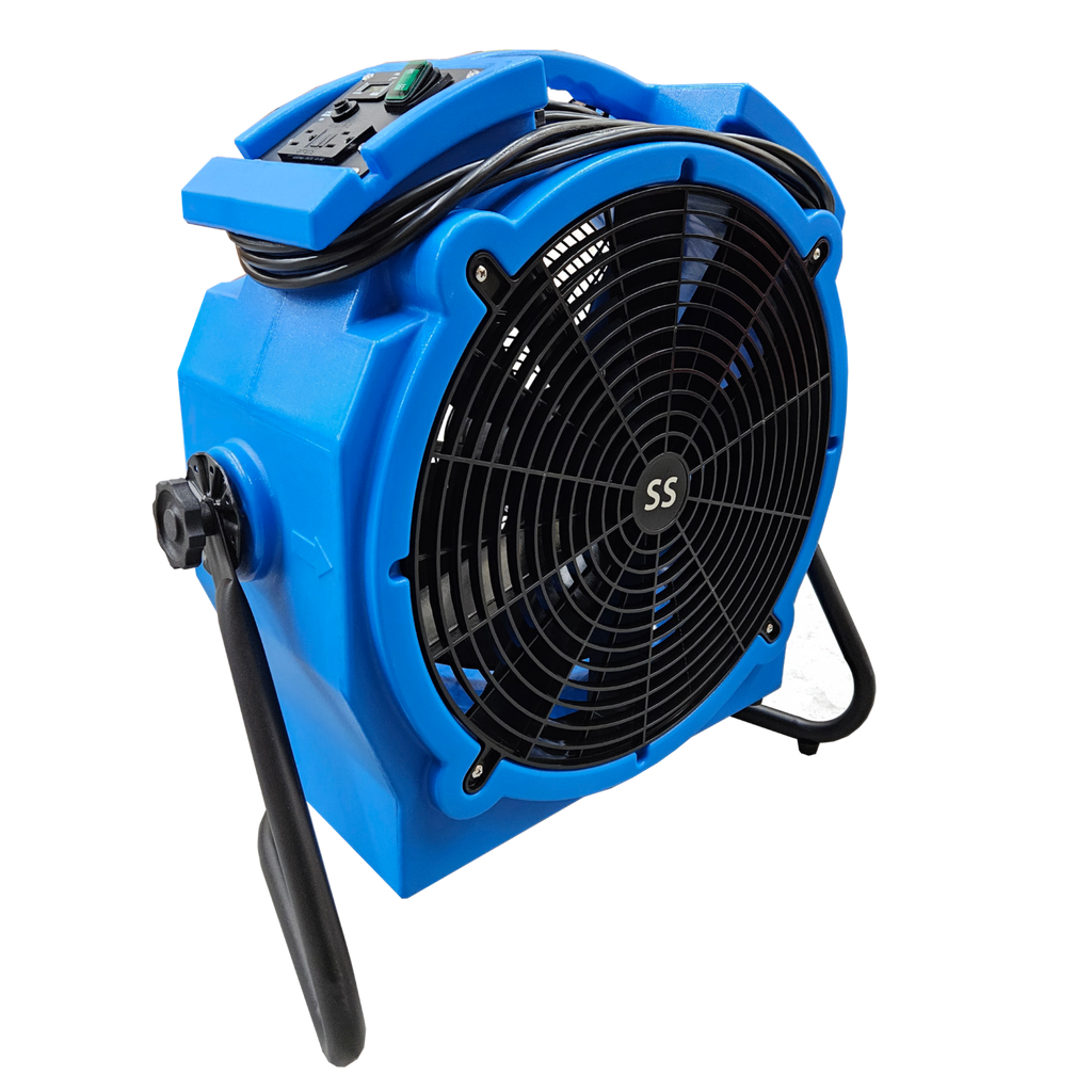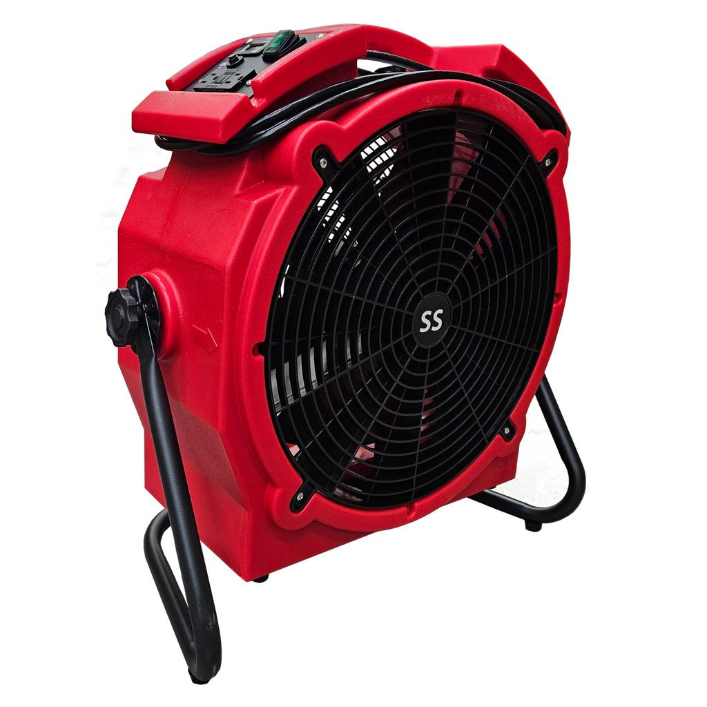 The SS Axial Air Mover by ASD Products is a flagship, high-performance axial fan designed for professionals who need efficient, ergonomic, and reliable air movement. Delivering 3000 CFM while drawing only 1.8 amps on high, this fan is ideal for water damage restoration, drying, and ventilation applications. Its advanced slotted front grill, interlocking stackable design, and compact 9.375″ width allow you to stack up to 10 high and daisy-chain up to 6 fans per 15-amp circuit, saving space and increasing productivity. Weighing just 22.95 lbs, the SS Axial is easy to carry and transport, and it comes with an hour meter, single-speed control, dual GFCI, and included stand. Available in multiple colors, it is engineered for maximum efficiency and durability in professional environments.