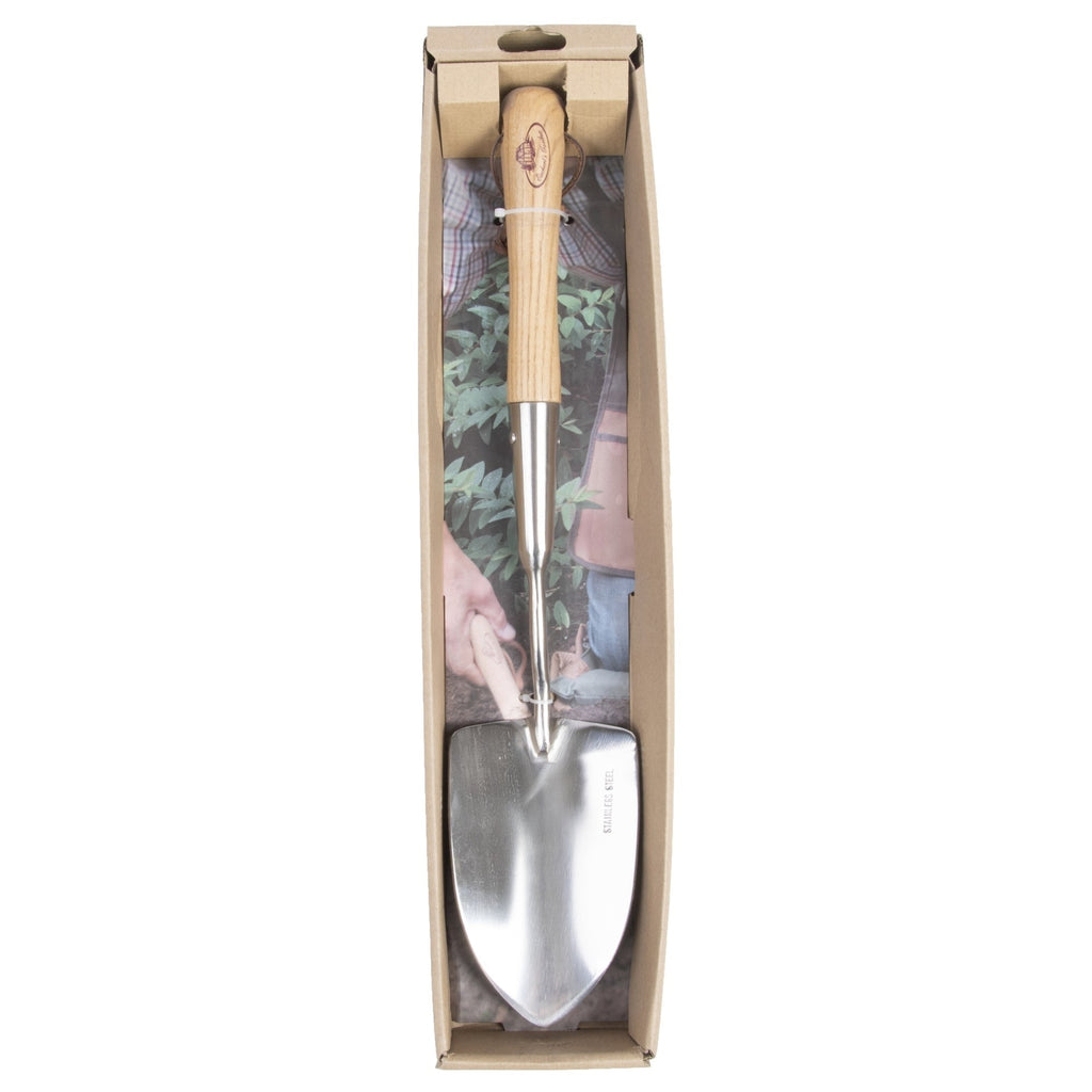 Make gardening easier with this Stainless Steel Shovel M. Crafted from durable stainless steel with an ashwood handle, it features a long handle for effortless digging and a leather hanging loop for convenient storage. Packaged in an open gift box, it makes a perfect gift for gardening enthusiasts.
