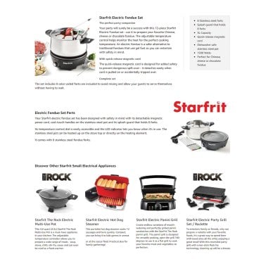 The Starfrit® 3.2-Quart Electric Fondue Set is the ultimate appliance for entertaining and enjoying delicious fondues. Whether you’re melting chocolate, warming cheese, or cooking meat, this electric fondue set offers the convenience of adjustable heat control, allowing you to achieve the perfect consistency every time. The 3.2-quart capacity makes it ideal for serving groups, and the non-stick coating ensures easy cleanup. Its sleek design and durable construction make it both stylish and functional. With this fondue set, you can host memorable gatherings and enjoy a fun, interactive dining experience.
