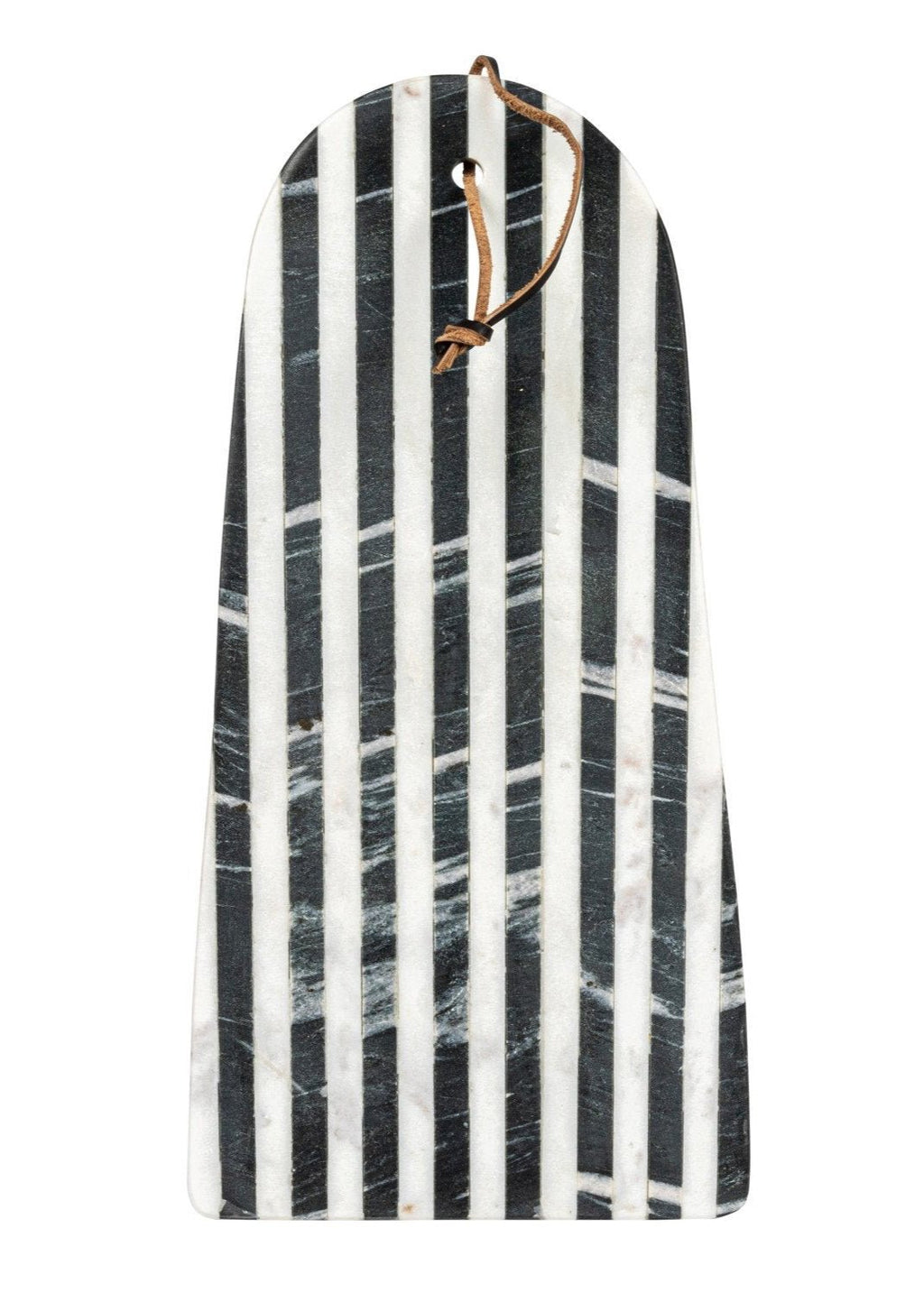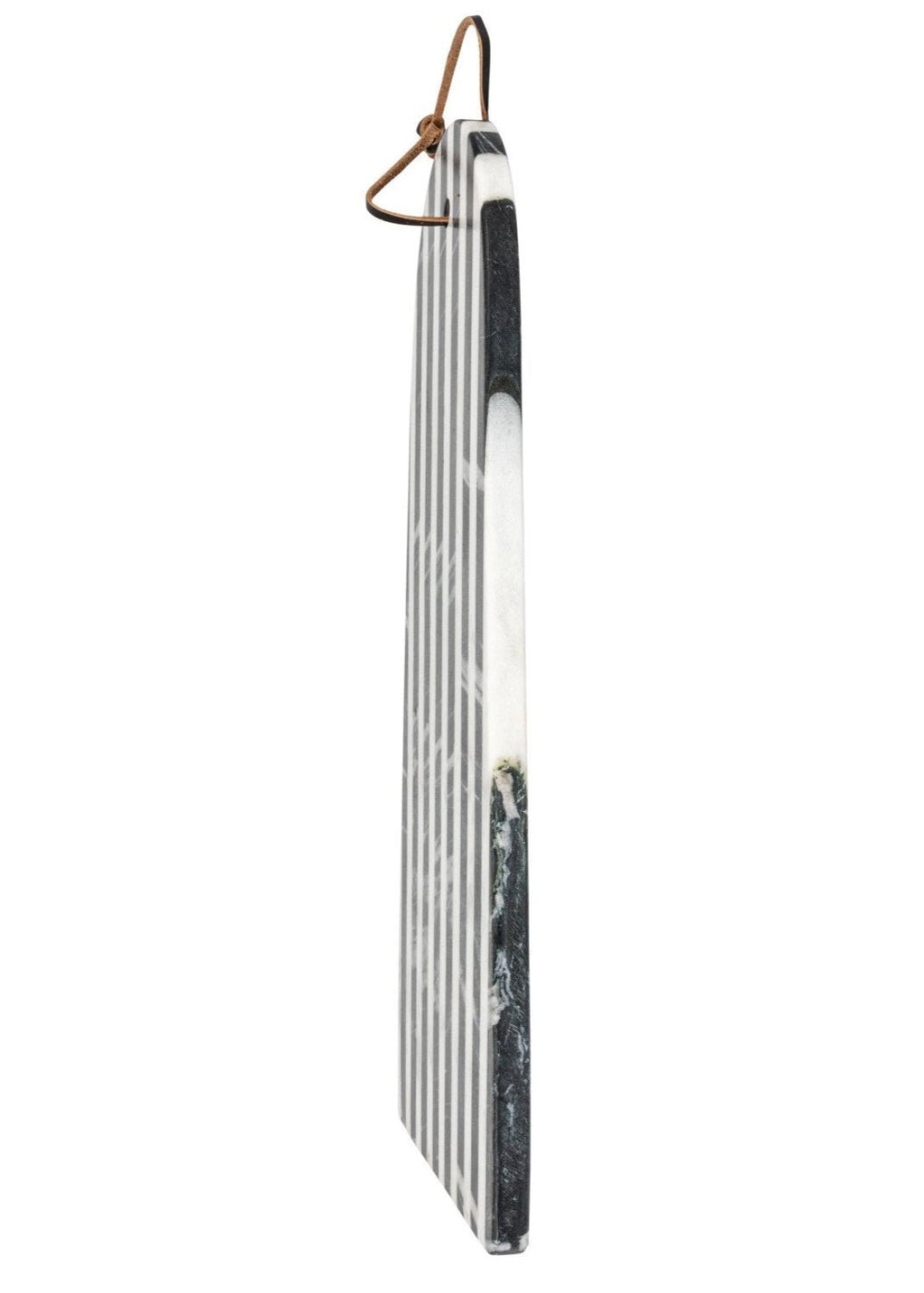 The Stripes & Leather Marble Cutting Board combines elegance and functionality, making it a standout addition to any kitchen or tablescape. Crafted from marble, bamboo, and wood in a striking black-and-white striped design, this 16-inch board is perfect for slicing, serving, and styling charcuterie, cheeses, or fresh bread. A rustic leather tie allows for easy hanging and storage, adding both charm and practicality. Whether used as a prep surface or a serving platter, this board elevates every meal with modern sophistication and artisanal appeal.
