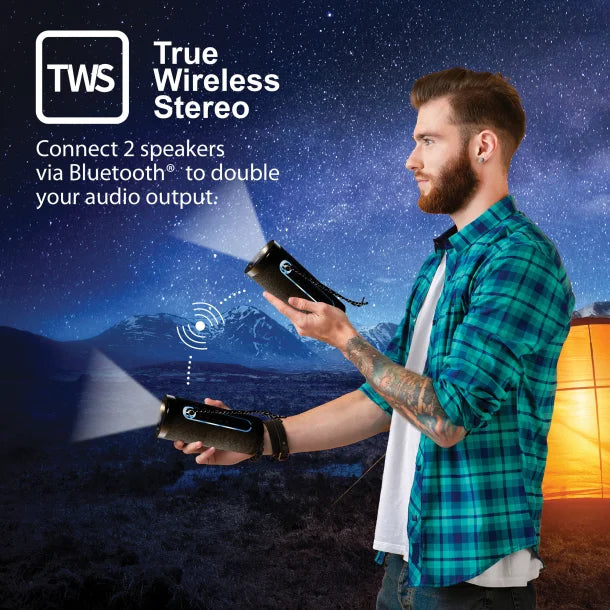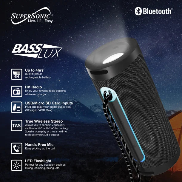Experience powerful sound and versatility with the Supersonic® Portable Bluetooth® Speaker SC-2340BT in sleek black. This all-in-one speaker features Bluetooth connectivity for wireless streaming, a built-in LED flashlight for added functionality, and a speakerphone for hands-free calls. Lightweight and portable, it’s perfect for outdoor adventures, travel, and everyday use. With its rechargeable battery and compact design, this speaker delivers high-quality audio and essential utility in a single device.