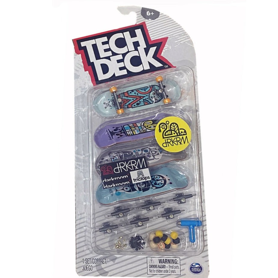 Experience the thrill of real skateboarding at your fingertips with the Tech Deck 96mm Fingerboard 4-Pack — “Pro Skate Series.” Each fingerboard features authentic graphics from some of the biggest skate companies in the world, including Darkroom, Blind, Baker, Flip, Finesse, Santa Cruz, Plan B, Sk8mafia, Toy Machine, and more.