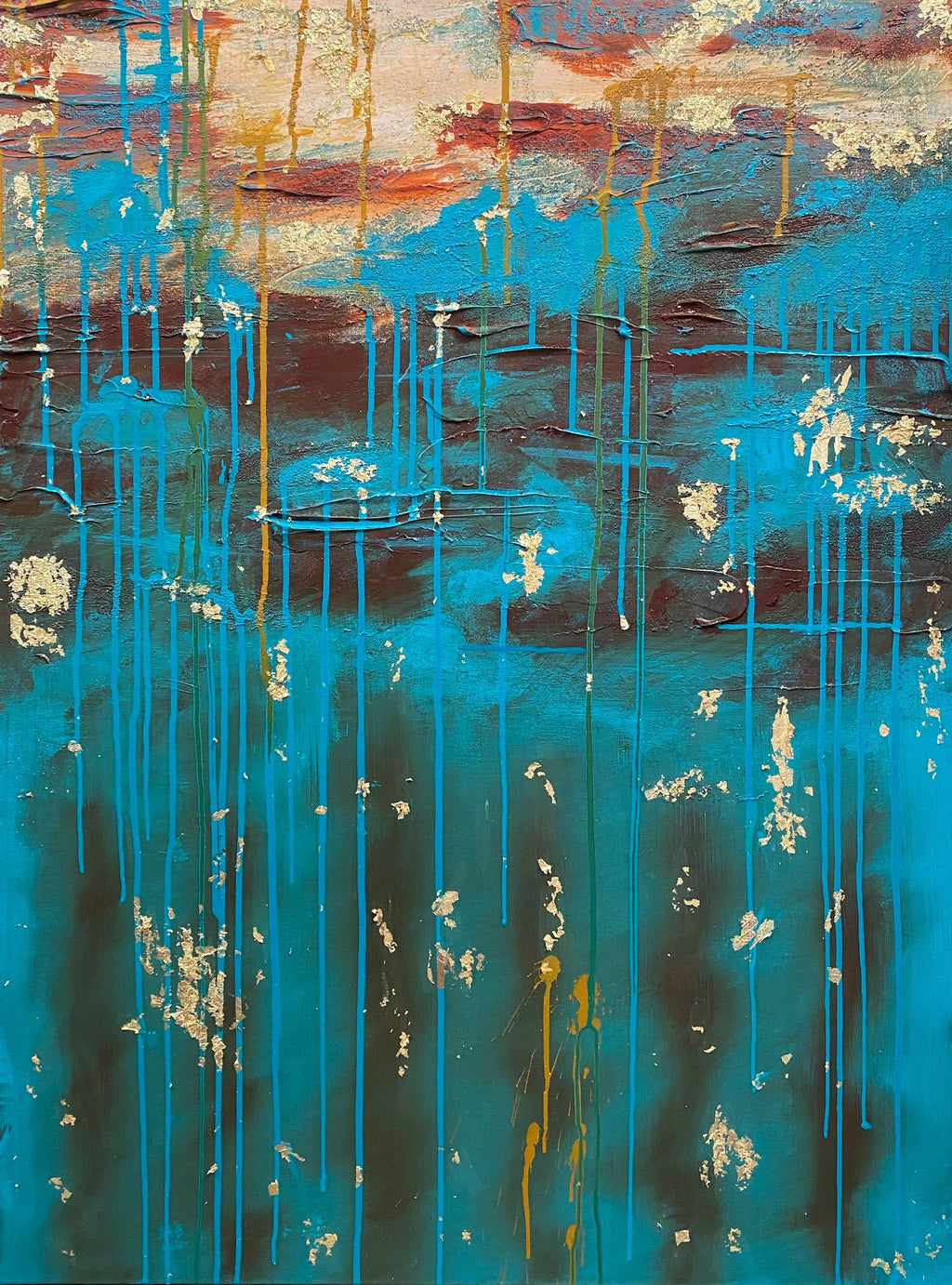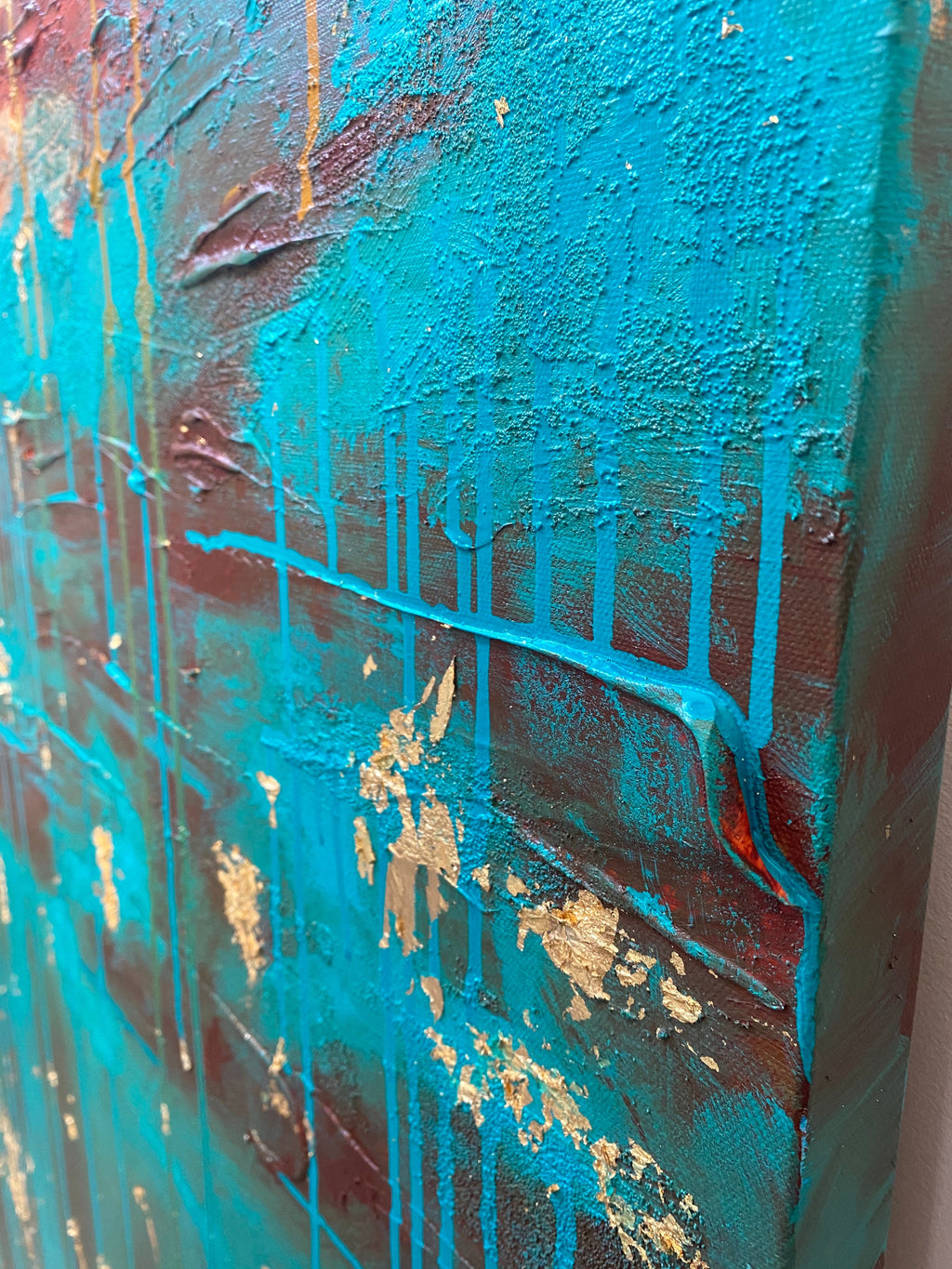 The Reef is a richly detailed abstract artwork hand painted on a gallery wrapped canvas using acrylic paint and mixed media techniques. Crackle effects, glass beads, and layers of silver and gold leaf create exceptional depth and texture, resulting in a visually dynamic piece that brings movement, luxury, and artistic sophistication to any interior.