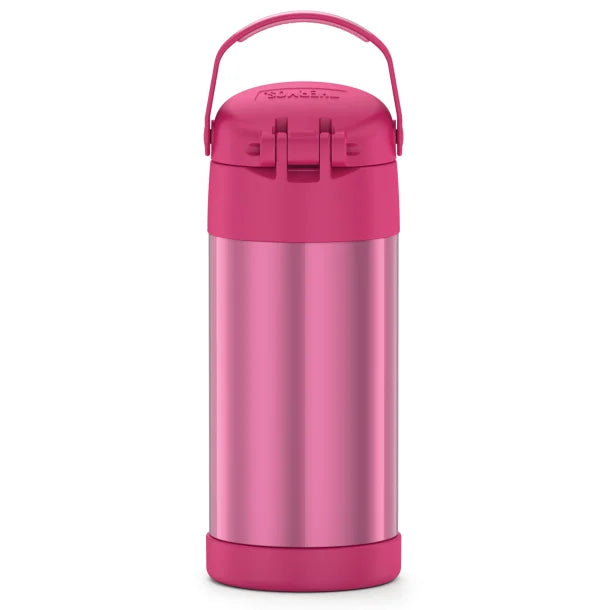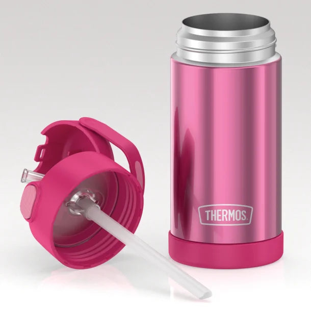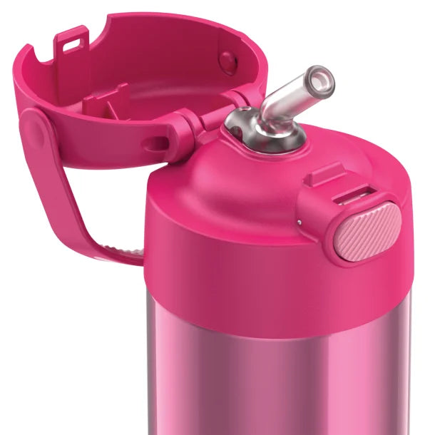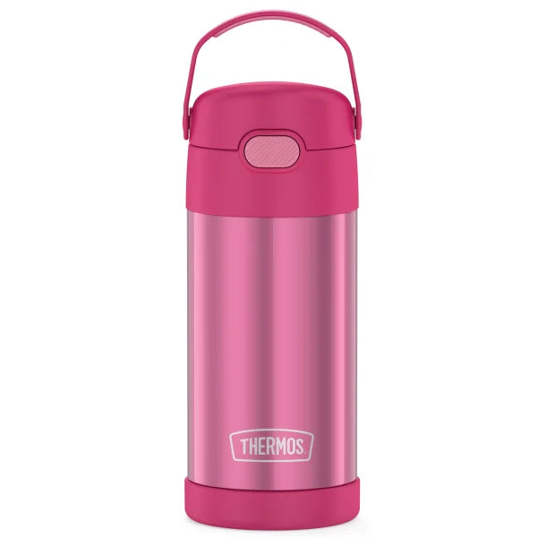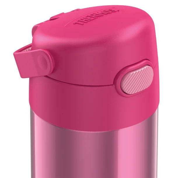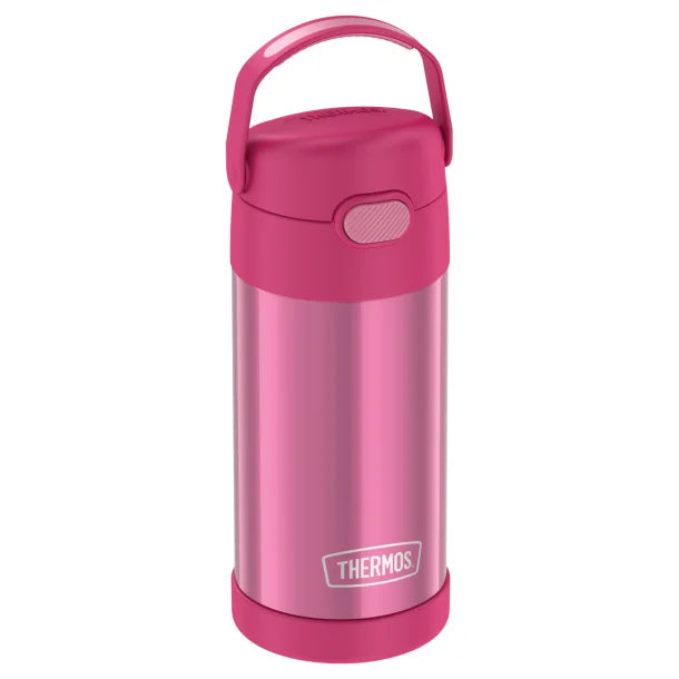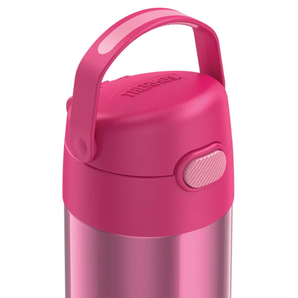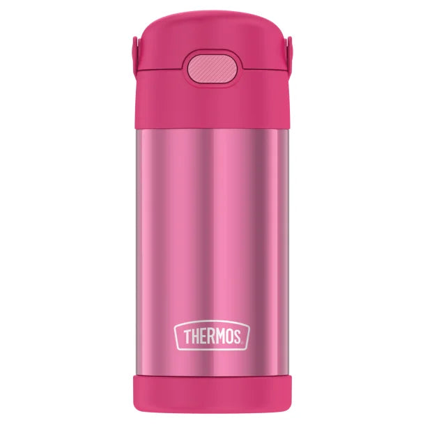The Thermos® 12-Ounce FUNtainer® Vacuum-Insulated Stainless Steel Bottle (Pink) is the perfect blend of practicality and style, designed to keep your beverages cold and refreshing for up to 12 hours. Its compact 12-ounce size makes it ideal for kids and adults alike, whether at school, work, or on outdoor adventures. Made from durable, BPA-free stainless steel, this bottle is built to withstand everyday use. The vibrant pink color adds a fun, cheerful touch, while the easy-to-use push-button lid with a pop-up straw ensures convenient, one-handed sipping. The spill-proof design makes it safe to carry in bags, making hydration on-the-go hassle-free.