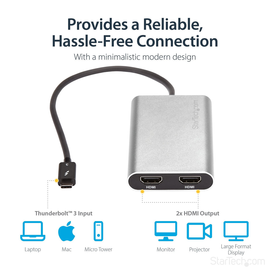 Connect two high-resolution displays with the Thunderbolt to Dual HDMI 2.0 Adapter, delivering crisp Dual 4K @ 60Hz output from a single Thunderbolt 3, Thunderbolt 4, or USB4 port. This Thunderbolt Certified adapter offers reliable, high-bandwidth HDMI connectivity for professional use cases including video production, graphic design, trading floors, and extended desktop setups. It works seamlessly with both macOS and Windows, and supports plug-and-play installation with no drivers required.