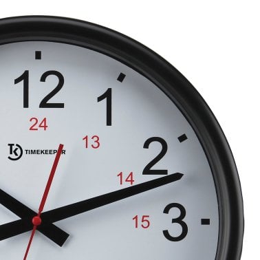 Timekeeper 14-In. Quartz Black and White Indoor/Outdoor Wall Clock with Standard and Military Time, Black and Red Hands, and Black Rim