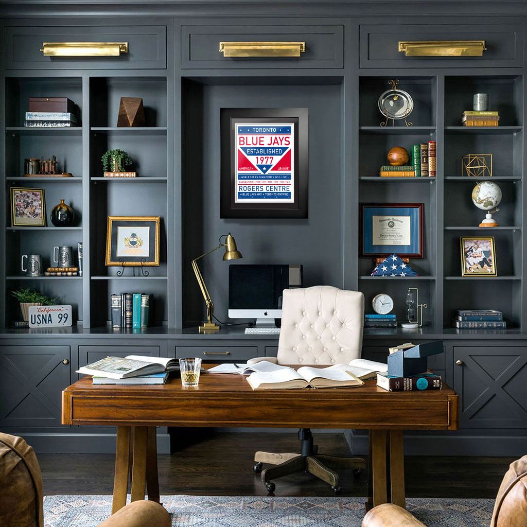 Show your Toronto Blue Jays pride with this 12" x 16" dual tone framed artwork, perfect for a fan cave, office, or bar. Features officially licensed MLB graphics, mounted in a high-quality MDF black frame with glass front panel and black & white team color faux matting. Ships with a protective acrylic cover and pre-mounted hanging hardware for easy display. Made in North America.
