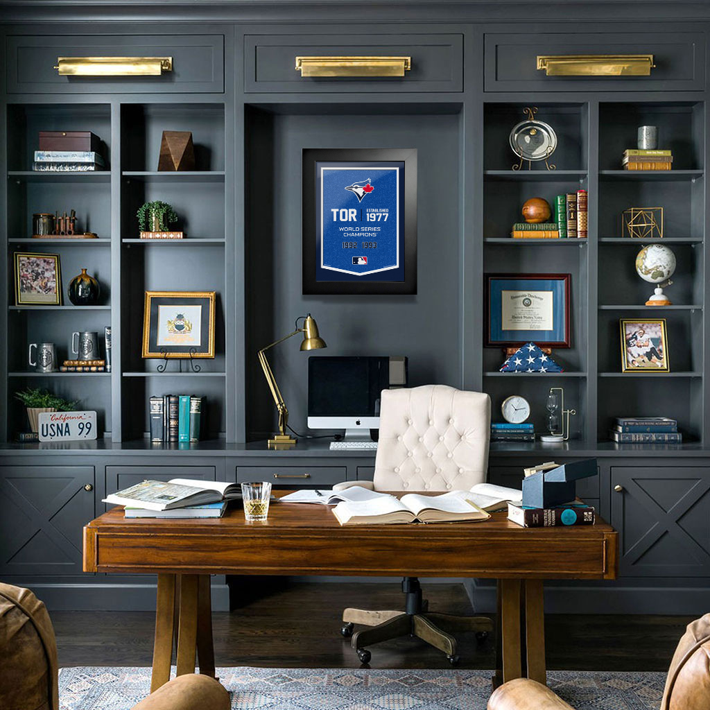 Show your Toronto Blue Jays pride with this 12" x 16" Team Empire framed artwork, perfect for a baseball fan cave, office, or bar. Features officially licensed MLB graphics, mounted in a high-quality frame with protective acrylic cover. Ships with pre-mounted hanging hardware for easy display. Assembled in Canada.