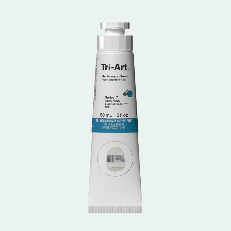 Tri-Art High Viscosity Acrylic Paint in Interference Green is a high-performance, professional-grade colour with thick, creamy consistency, vibrant chroma, and excellent texture retention. Made with 100% finest acrylic emulsion and highest-grade pigments, it delivers authentic pigment characteristics and rich colour depth. Smooth and easy to manipulate with a brush or palette knife, it is ideal for alla prima painting or for use with mediums to adjust viscosity, extend volume, or modify luster. High pigment concentration allows for enhanced colour intensity, and all pigments are selected for permanence, purity, and outstanding lightfastness. The paint film dries flexible and resistant to climatic changes, with no fillers or extenders used.