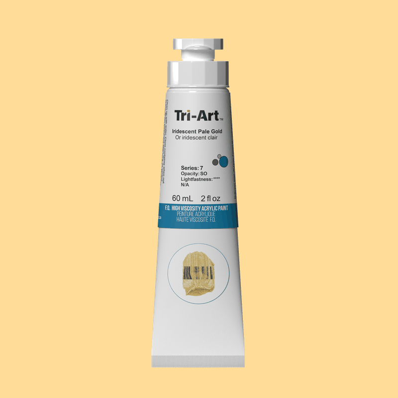 Tri-Art High Viscosity Acrylic Paint in Iridescent Pale Gold is a high-performance, professional-grade colour with thick, creamy consistency, vibrant chroma, and excellent texture retention. Made with 100% finest acrylic emulsion and highest-grade pigments, it delivers authentic pigment characteristics and rich colour depth. Smooth and easy to manipulate with a brush or palette knife, it is ideal for alla prima painting or for use with mediums to adjust viscosity, extend volume, or modify luster. High pigment concentration allows for enhanced colour intensity, and all pigments are selected for permanence, purity, and outstanding lightfastness. The paint film dries flexible and resistant to climatic changes, with no fillers or extenders used.