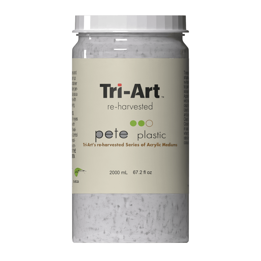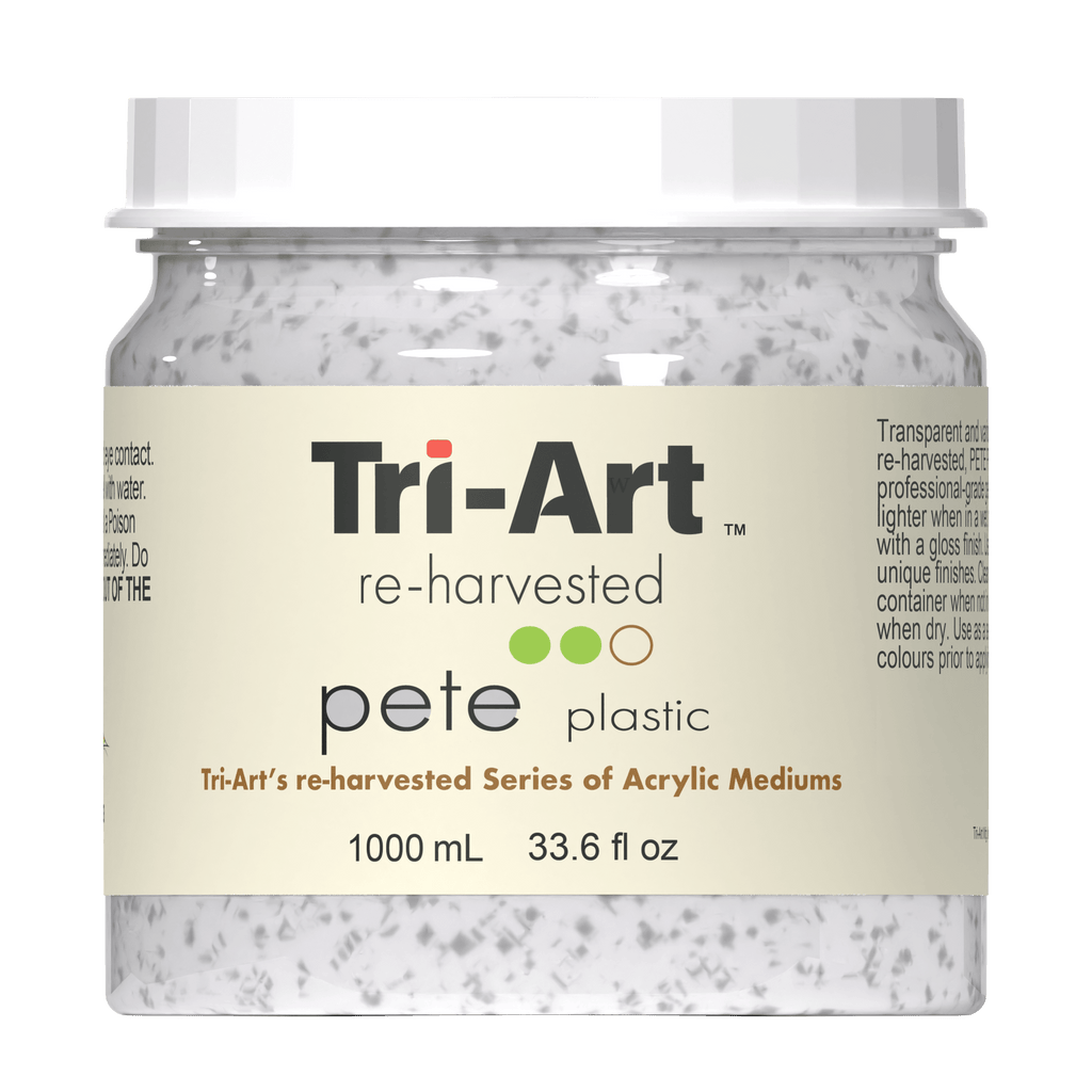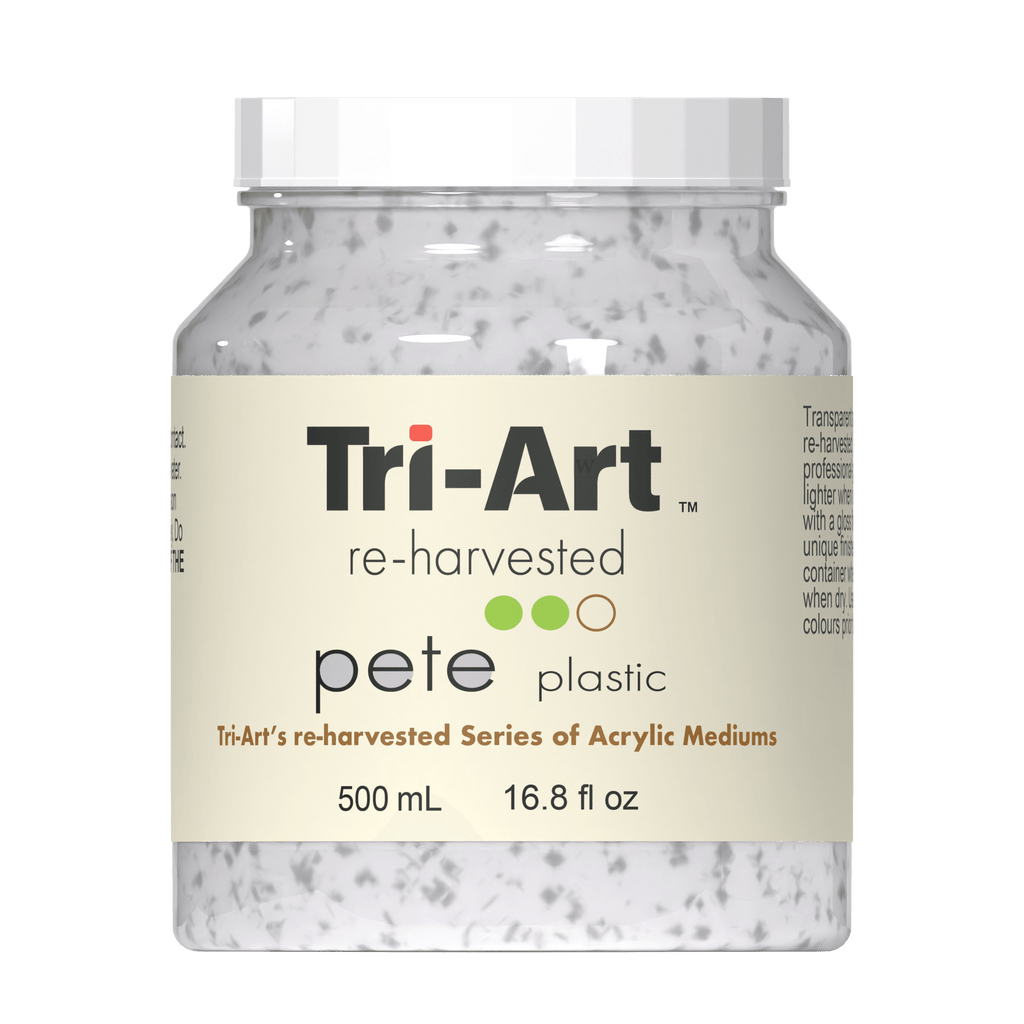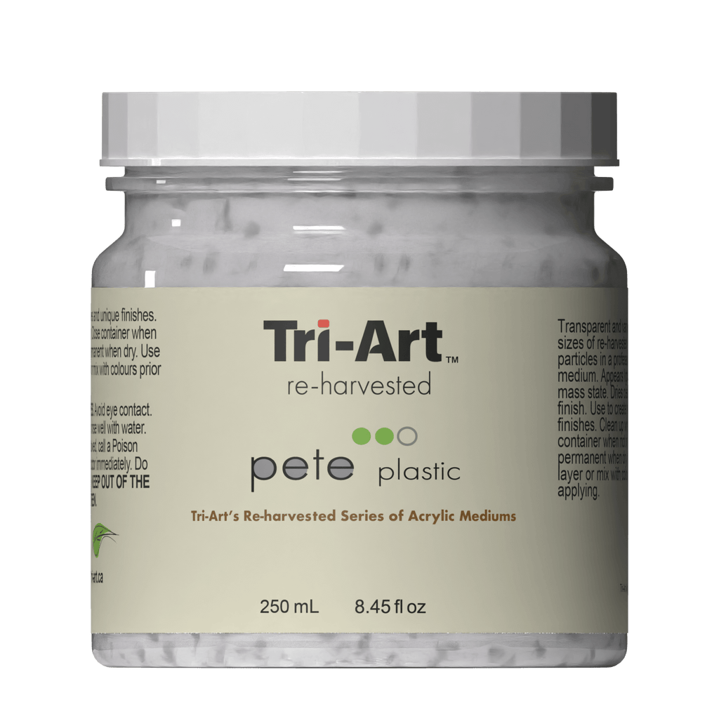 Tri-Art Re-Harvested PETE Plastic contains transparent PETE plastic shards of varying shapes and sizes, sourced from re-grinded materials from packaging manufacturing. Incorporated into a high-quality acrylic medium, it provides excellent adhesion, flexibility, and clear glossy finish once dry. Perfect for creating unique textures and mixed media effects, these shards can be used alone or combined with Tri-Art Acrylic Colours to enhance surface detail and visual interest in your artwork.