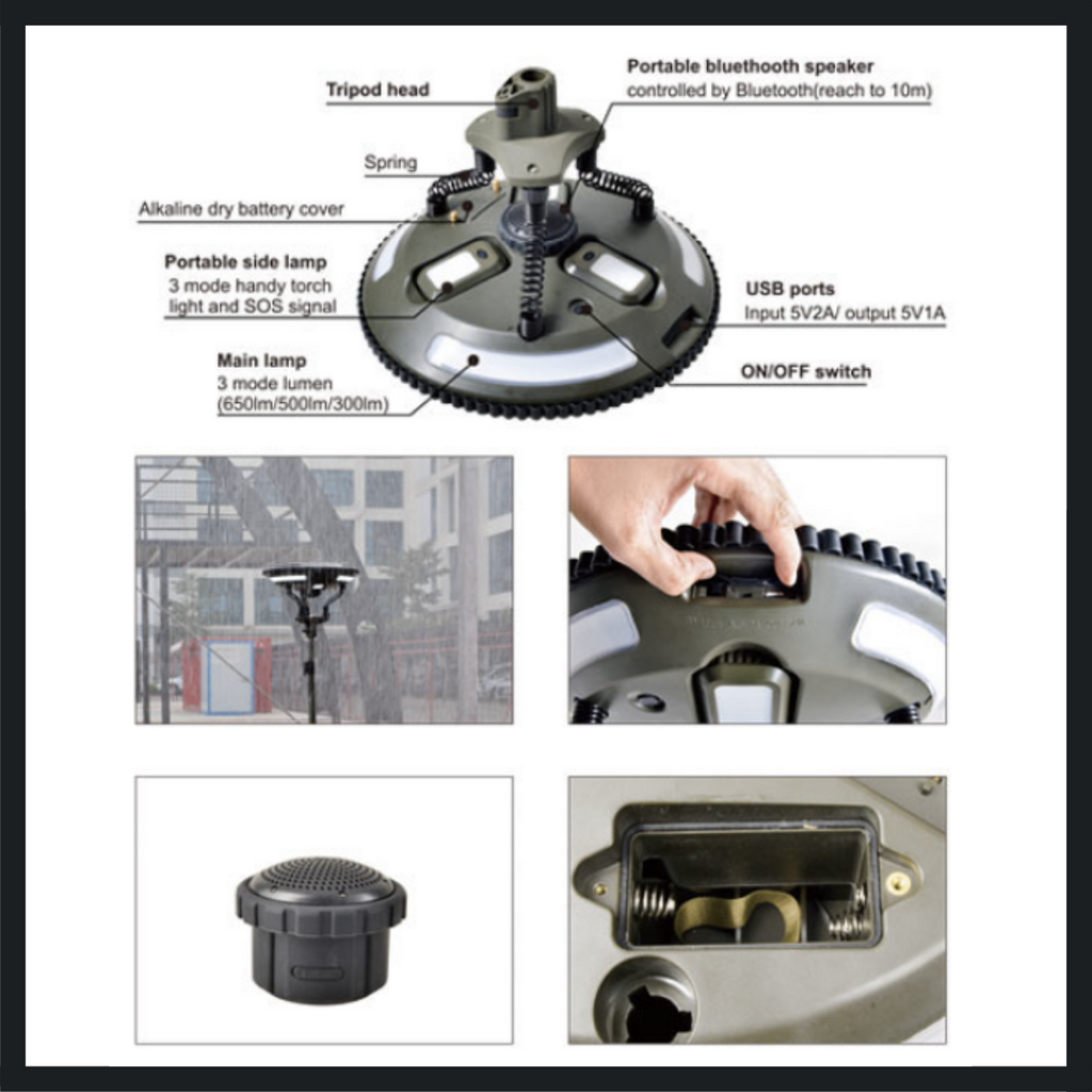 Multi-Mode Side Lamps: Each side lamp features Bright, Dim, Torch, Strobe, and Mosquito Repellent modes for versatile use.