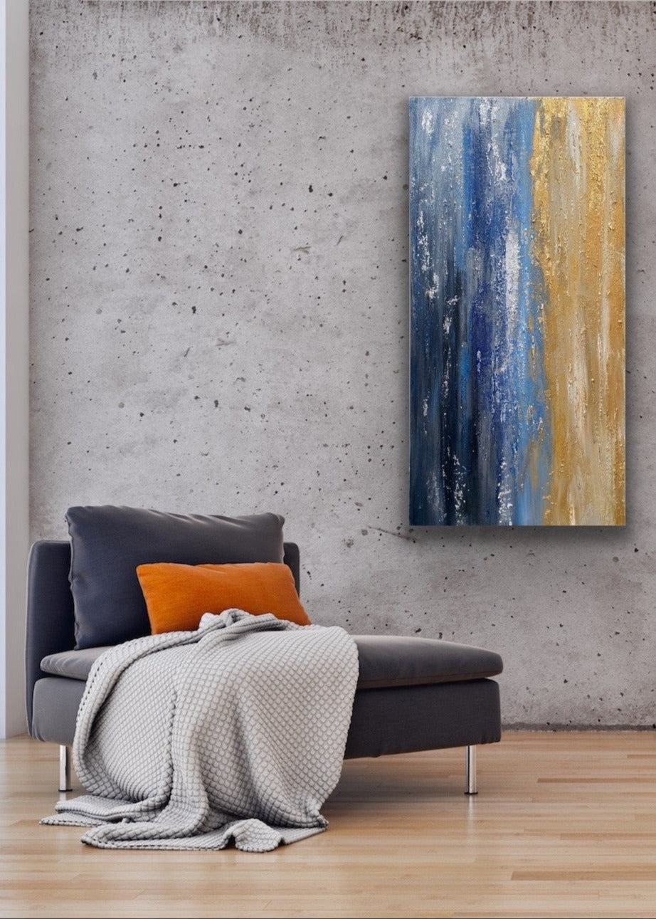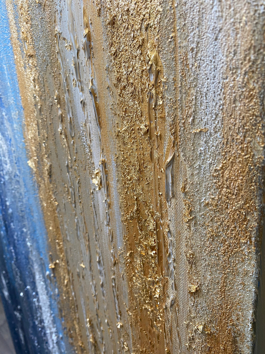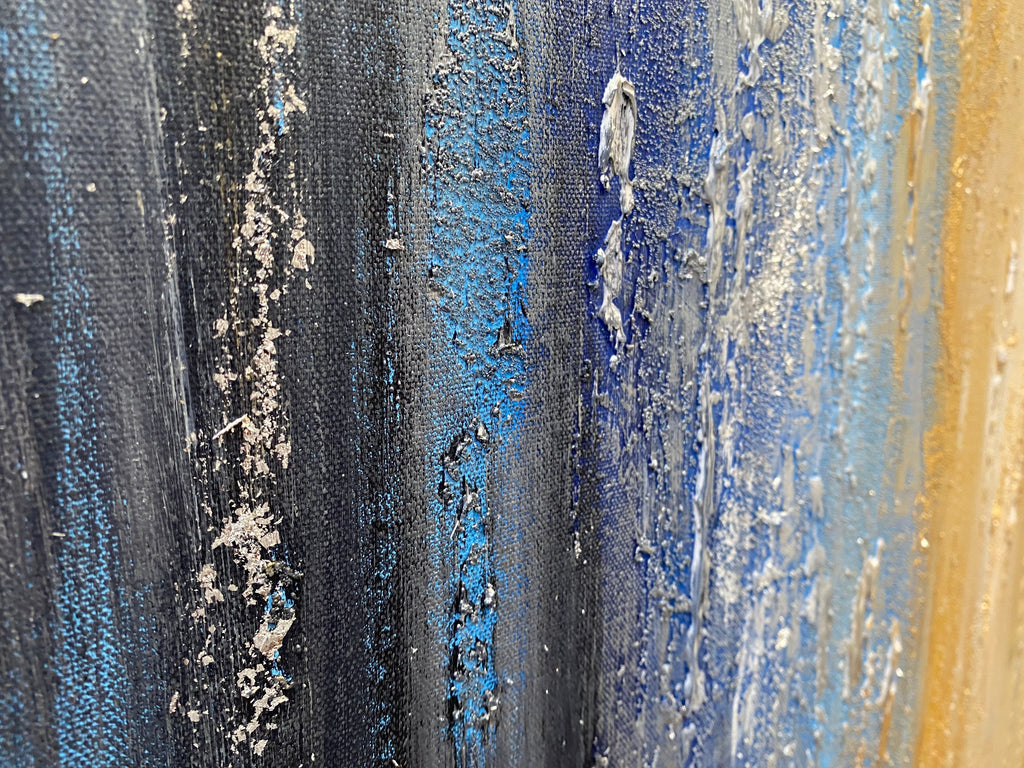 Twilight is a captivating abstract artwork hand painted on a gallery wrapped canvas using acrylic paint and mixed media techniques. Crackle effects, glass beads, and layers of silver and gold leaf add remarkable depth and texture, creating a dynamic composition that evokes atmosphere, movement, and refined artistic elegance.